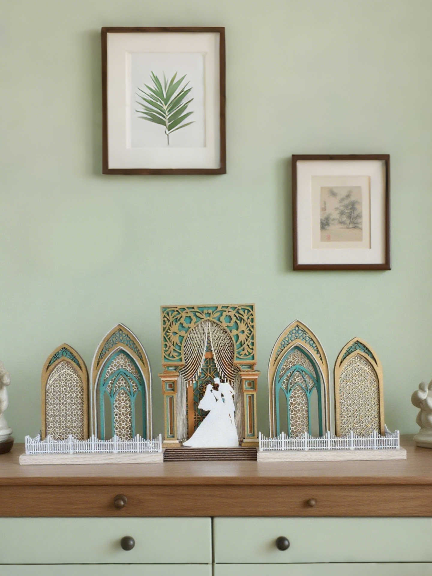 Central to the design is a delicately layered wedding arch and couple, surrounded by intricate lattice and architectural details for visual depth and sculptural presence. Its artistic construction is both lightweight and durable, offering flexible placement as a standing display or wall-mounted feature, making it the perfect addition to both modern and transitional homes. This sculptural panel arrives carefully packed and ready to transform interiors or serve as a cherished wedding keepsake.