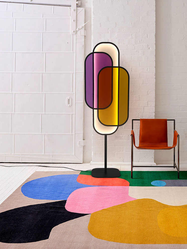 Designer-inspired atmosphere floor lamp featuring bold overlapping colored acrylic panels (amber, purple, yellow) and black metal trim for sculptural, artistic impact.