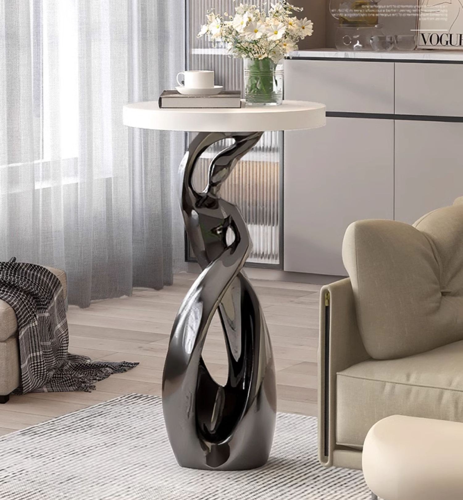 Transform living spaces with this Abstract Art Luxury Floor Sculpture Table—an eye-catching decorative piece designed for contemporary homes. The sinuous twist base in a high-gloss metal finish serves as both sculpture and functional support for the round matte tabletop, bringing artistic energy and sophistication to any corner. Sized at 15.7 inches diameter and 28.3 inches height, it doubles as an accent table for coffee, books, or décor items, while acting as a statement art object in living rooms, by the TV stand, or near sofas and armchairs. Durable and stable, this abstract sculpture makes an exceptional gift for new homeowners, newlyweds, or anyone looking to elevate their interior with luxury charm and creative flair.