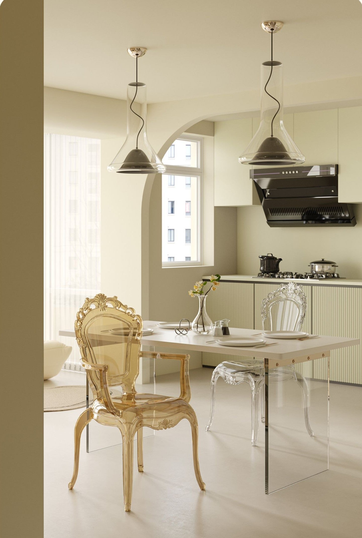 Stunning amber-transparent acrylic resin, crafted in classic palace style for a regal "ghost chair" effect—luxurious, modern, and easy to clean.