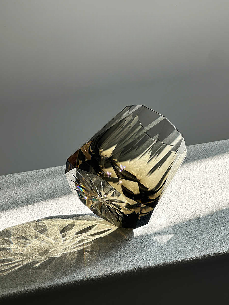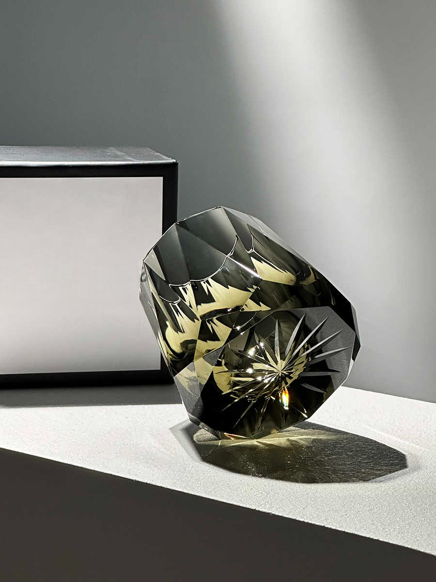 Handcrafted from premium lead-free K9 crystal, offering dramatic geometric facets, smoky black tones, and exclusive light-reflective artistry.