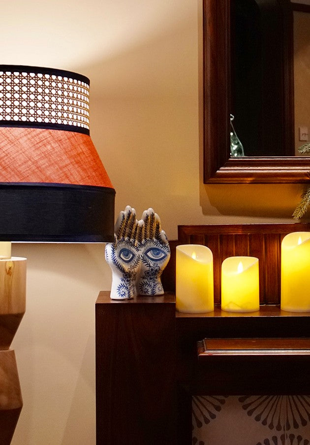 Unique cupped hands design creates a meaningful display piece symbolizing protection, mindfulness, and spiritual awareness.