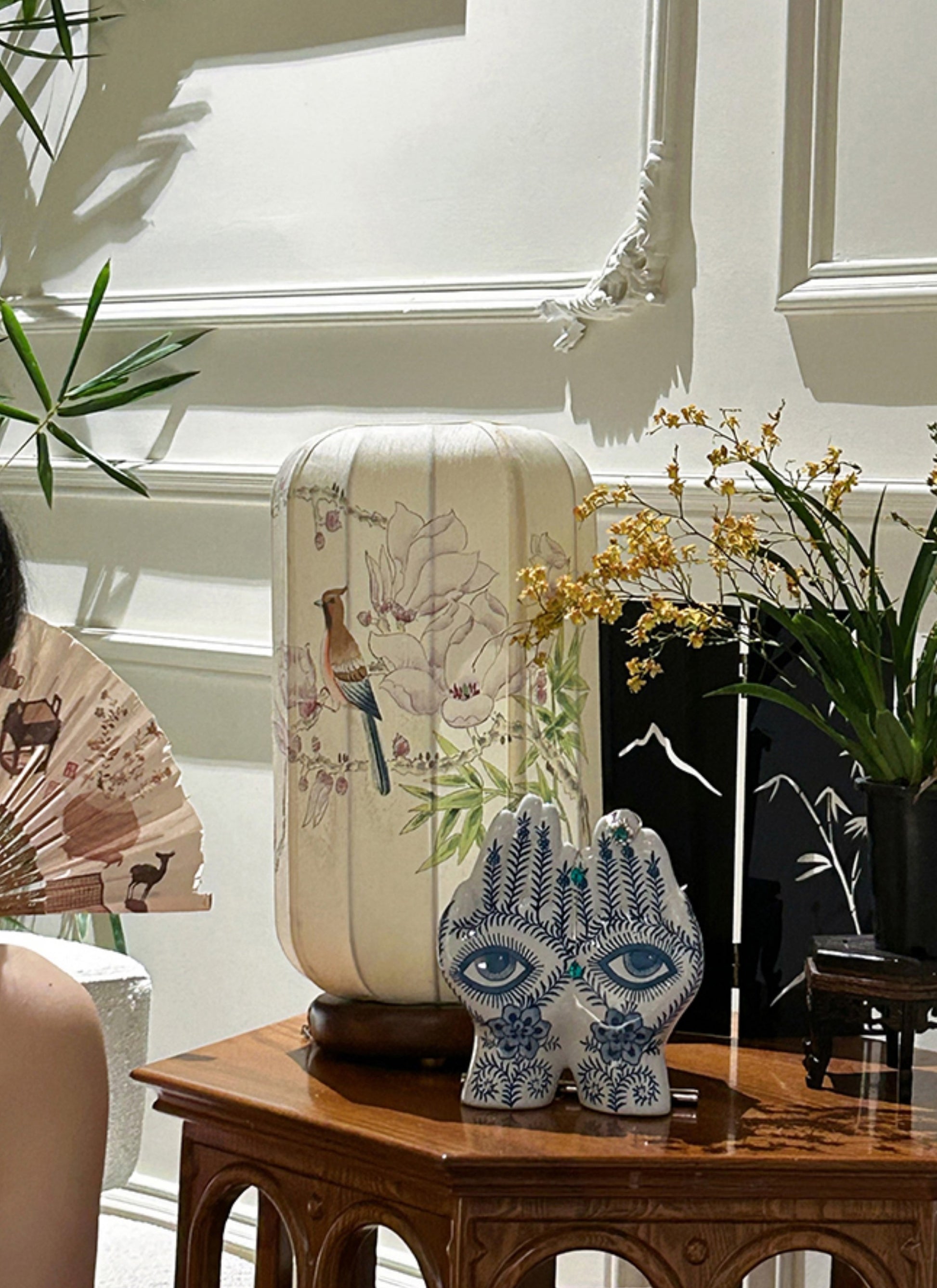 Blue and White Porcelain Hand Sculpture, Ceramic Eye Design Decorative Ornament, Traditional Asian Artistry Desk Accent with Gift Box