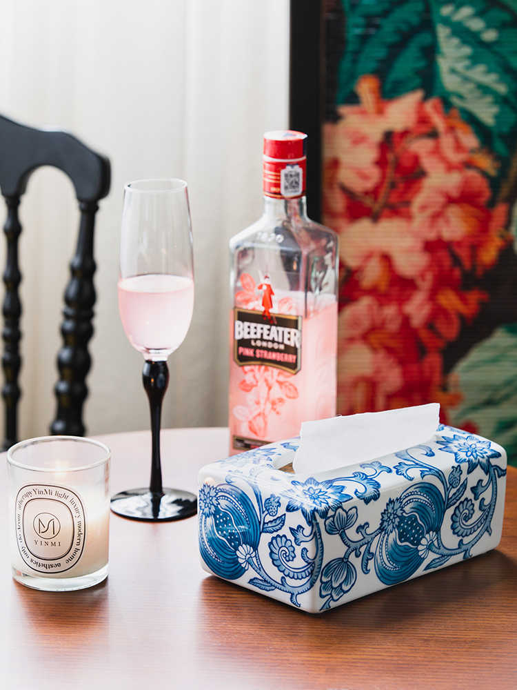 High-quality blue and white porcelain tissue box set includes Hand Grenade Fragrance and Auspicious Phoenix designs for classic décor.