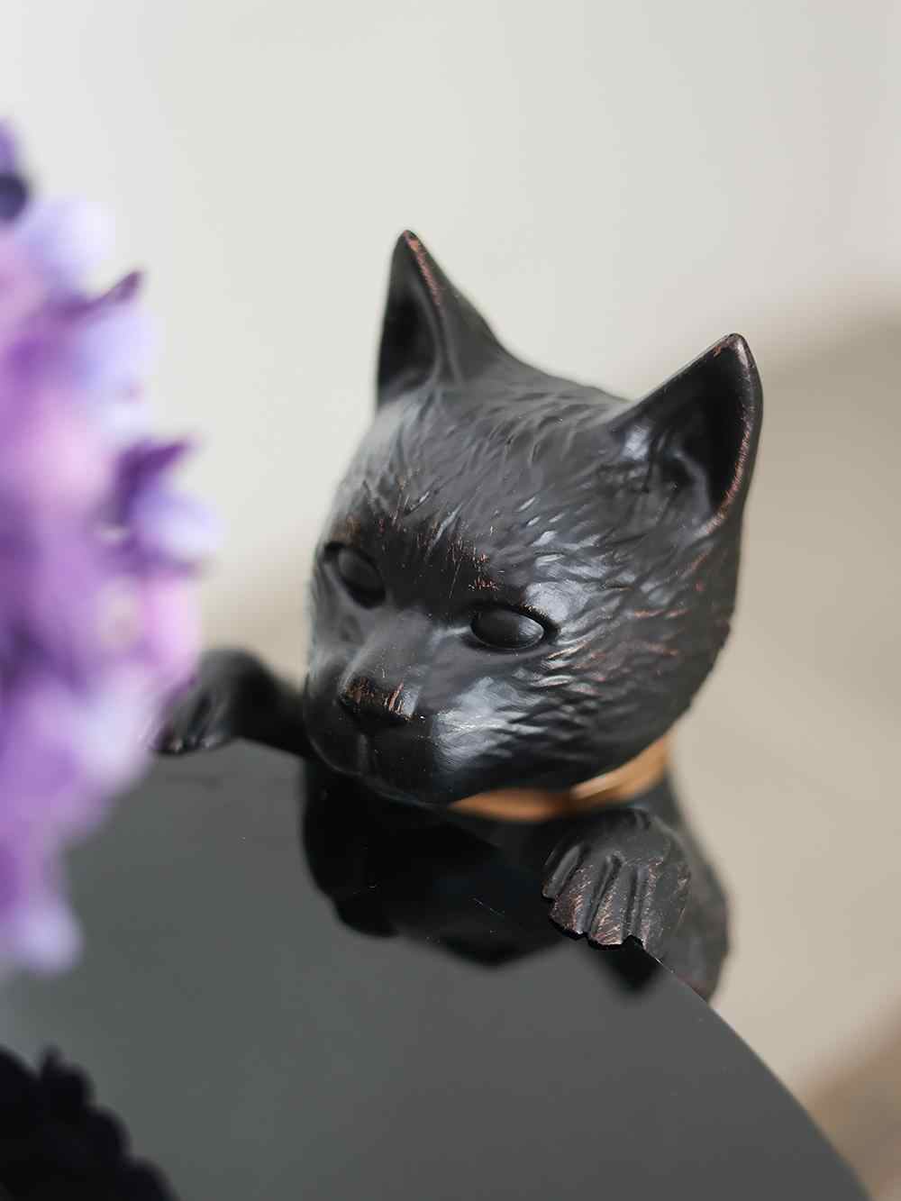 Unique Italian mid-century modern side table featuring a lifelike sculptural cat on tiptoe, finished in matte black with a subtle gold collar detail.