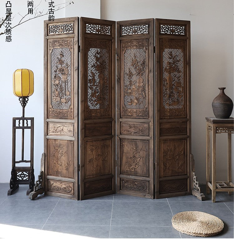 Elevate your home or studio with this Vintage Solid Wood Folding Screen, a stunning example of traditional craftsmanship and classical beauty. Each panel measures 205x45cm, with the four-panel configuration creating an expansive, visually impactful room divider or privacy screen. Every surface is adorned with hand-carved, hollow-out floral and geometric designs, reflecting ancient artistry and adding unique character to any setting.