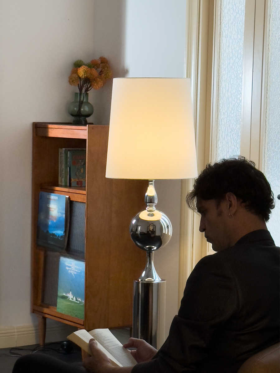 White lampshade diffuses ambient light softly, creating warm, comfortable atmosphere while complementing retro and contemporary interiors.