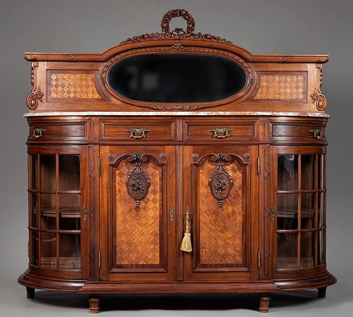 Elevate sophisticated interiors with this Classical Floral Antique Sideboard Cabinet, a masterpiece of European heritage design. Stately proportions unite ornate hand-carved woodwork, dazzling floral inlays, and a magnificent oval centerpiece mirror framed by a detailed crest. The natural marble countertop lends a touch of opulence and enduring surface for both serving and display. Thoughtfully designed storage compartments, including central cabinets, side glass-fronted display shelves, and upper drawers, meet practical needs while enhancing décor. Ideal as a statement dining buffet, entryway console, or luxurious display cabinet, this custom antique piece embodies the pinnacle of French furniture artistry, offering timeless elegance, functionality, and historical character for upscale homes and estates.