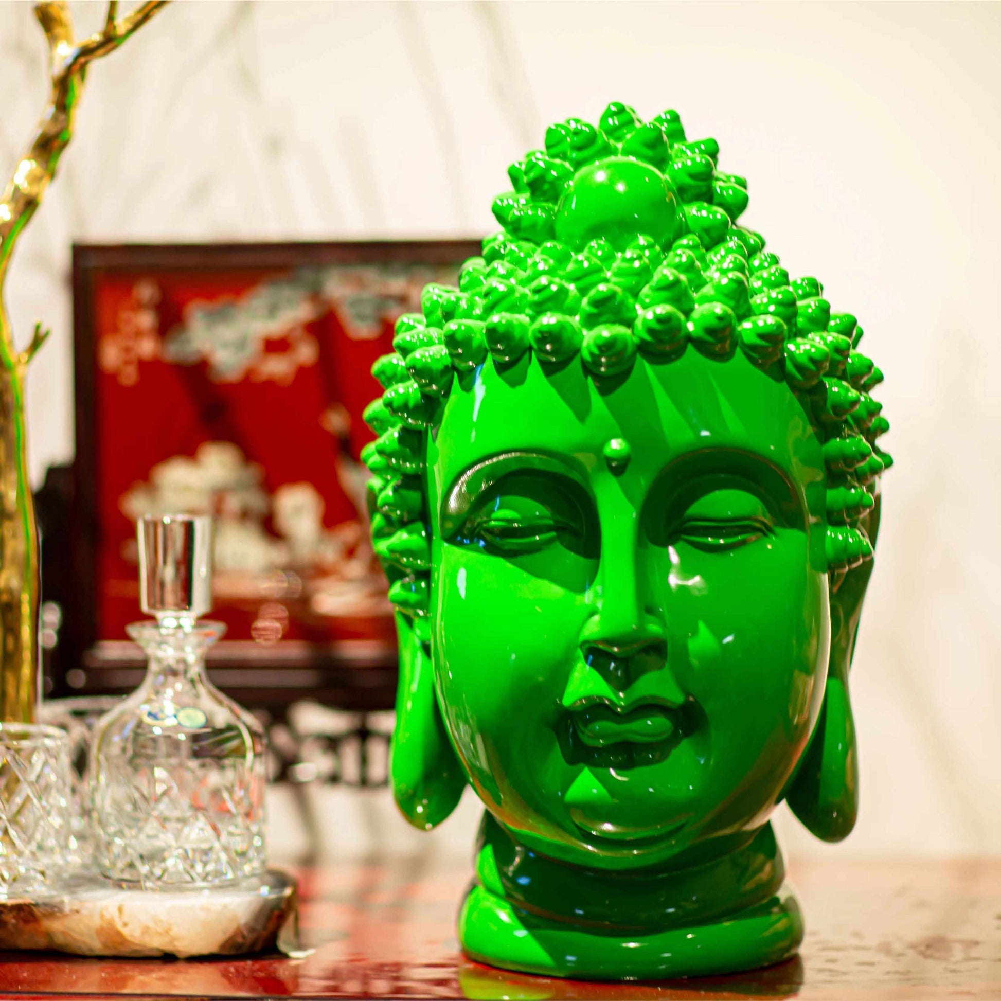 Vibrant emerald green Buddha head sculpture featuring lustrous painted finish and intricate curly hair detailing, bringing serenity and spiritual elegance to modern interiors.