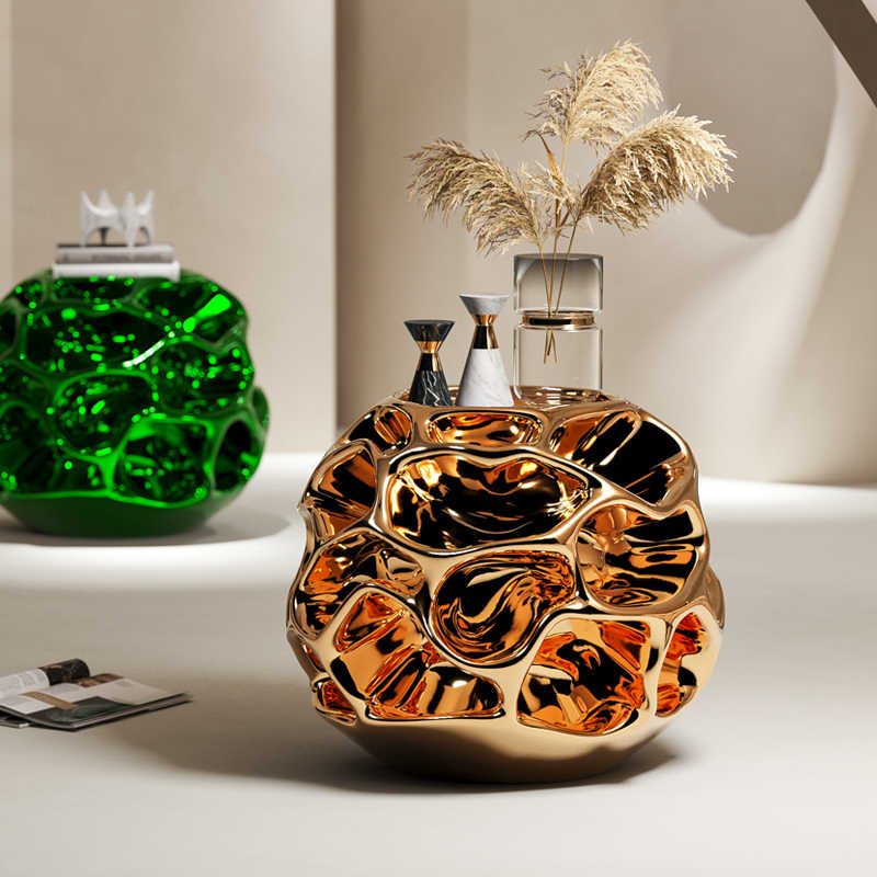Stunning honeycomb-inspired sculptural side table with glossy gold finish creates dramatic light reflection and organic artistic appeal for modern interiors.