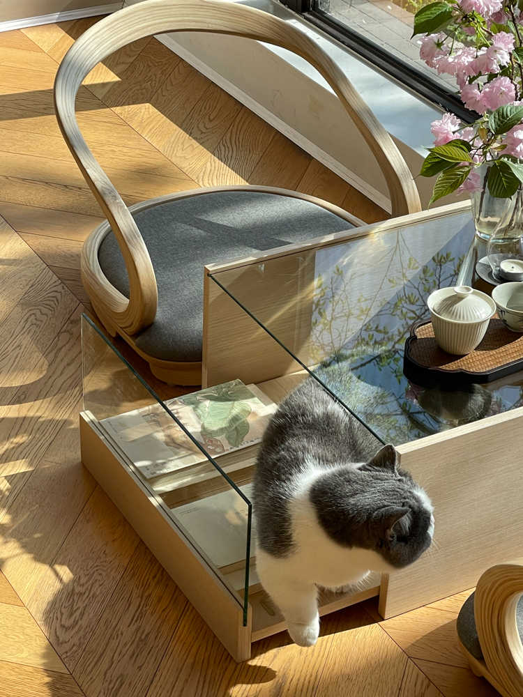 Innovative storage integration features glass-top table with hidden compartment below for organizing tea accessories and meditation items.