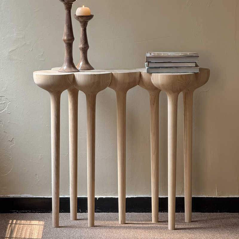 Elevate your entryway with this Degas Custom Esgrimas Solid Wood Console Table Set, featuring distinctive sculptural pedestals that transform functional furniture into artistic statements. Each piece showcases the brand's signature attention to proportion and craftsmanship with unique mushroom-style turned legs that create striking silhouettes.