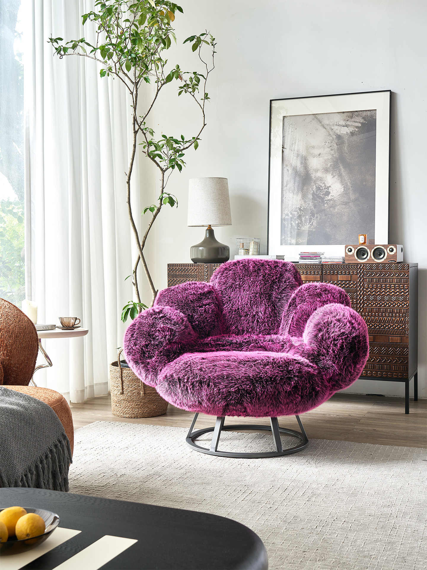 Materials: Premium Long-Pile Faux Fur + Contemporary Swivel Base + High-Density Foam Cushioning + Steel Frame Construction + Sculptural Form Design