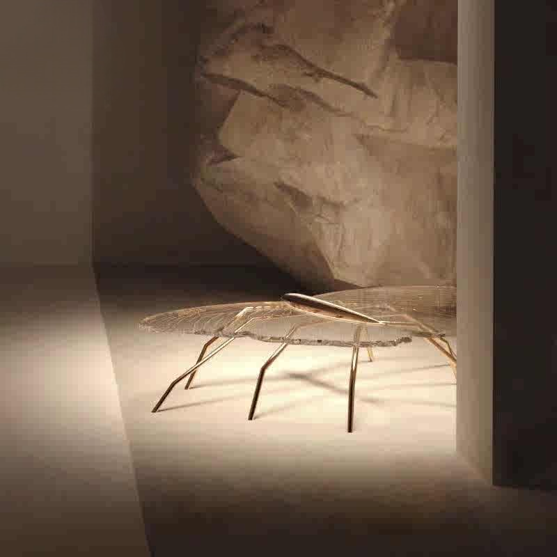 Artistic wireframe wings and polished acrylic body create a sculptural centerpiece, doubling as functional furniture and contemporary art.