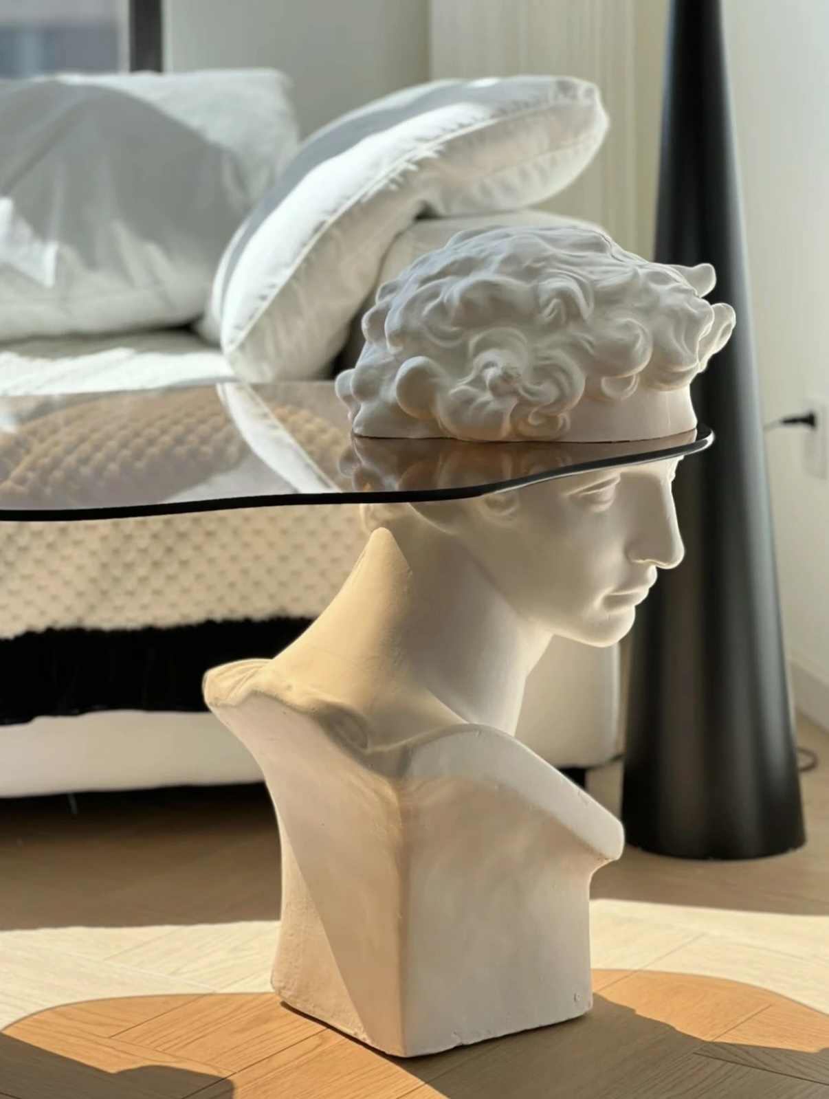 Artistic statement coffee table featuring a sculptural base inspired by the classic form of Michelangelo’s David, crafted in premium matte resin for a high-end look.