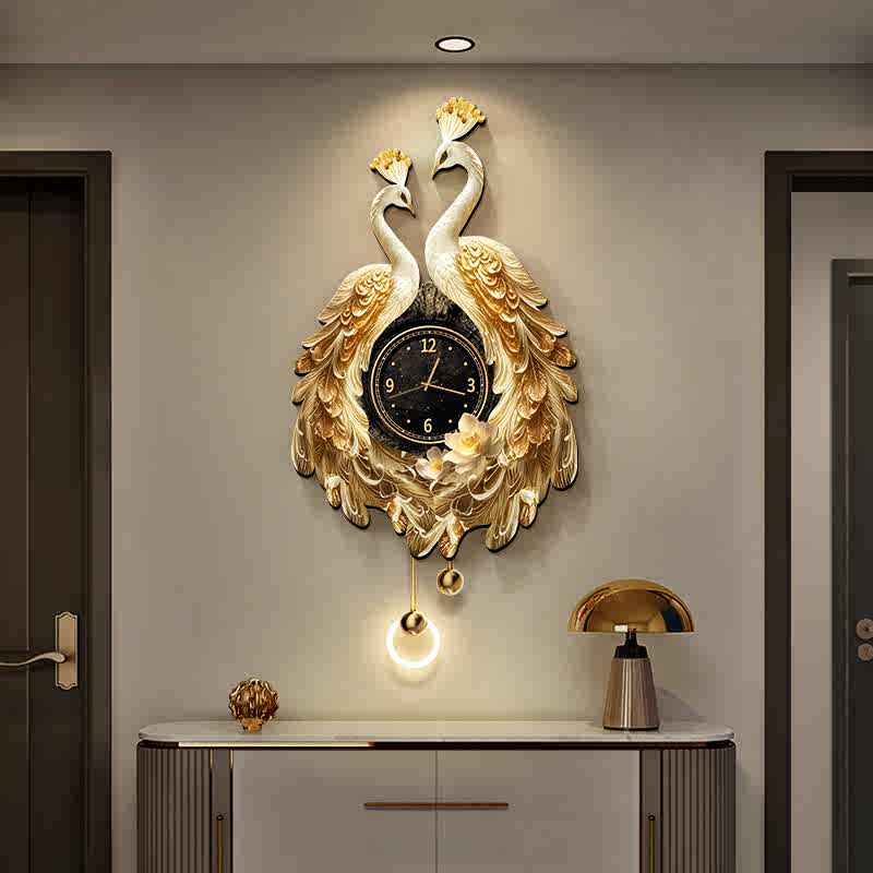 Elegant Dual Peacock 3D Wall Clock with LED Light, Luxury Resin Decorative Art for Living Room, Remote-Control Modern Wall Decor