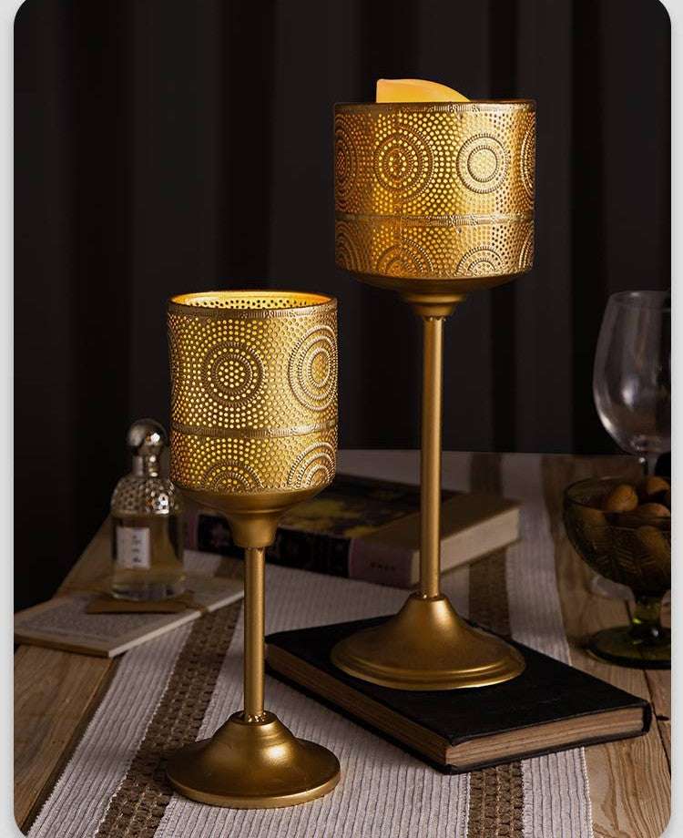 Create unforgettable romantic moments with this exquisite European Vintage Gold Perforated Metal Candle Holder, where timeless French elegance meets sophisticated lighting design. The intricate perforated patterns transform ordinary candlelight into captivating shadow displays that dance across your dining space, creating the perfect ambiance for intimate dinners and special celebrations.