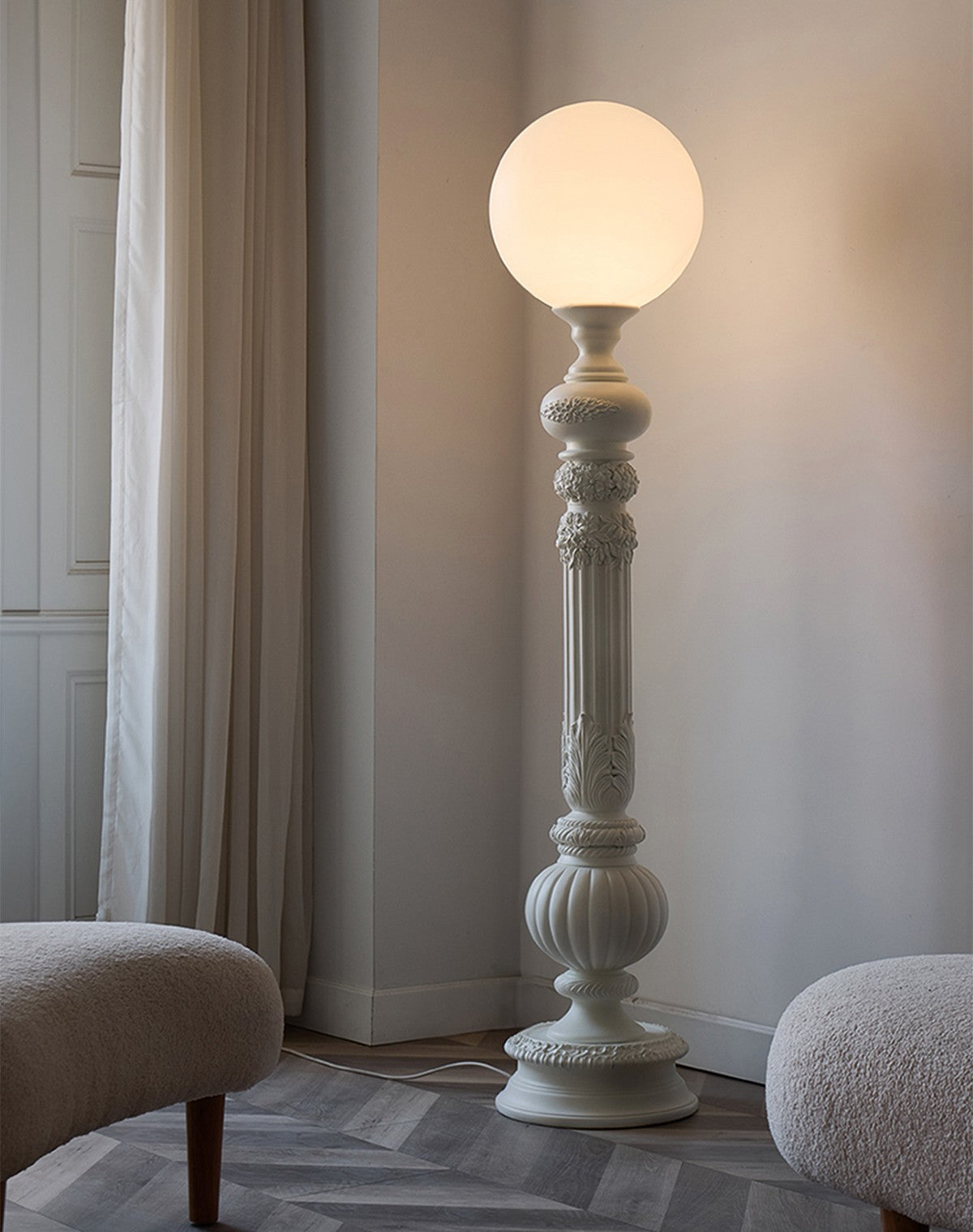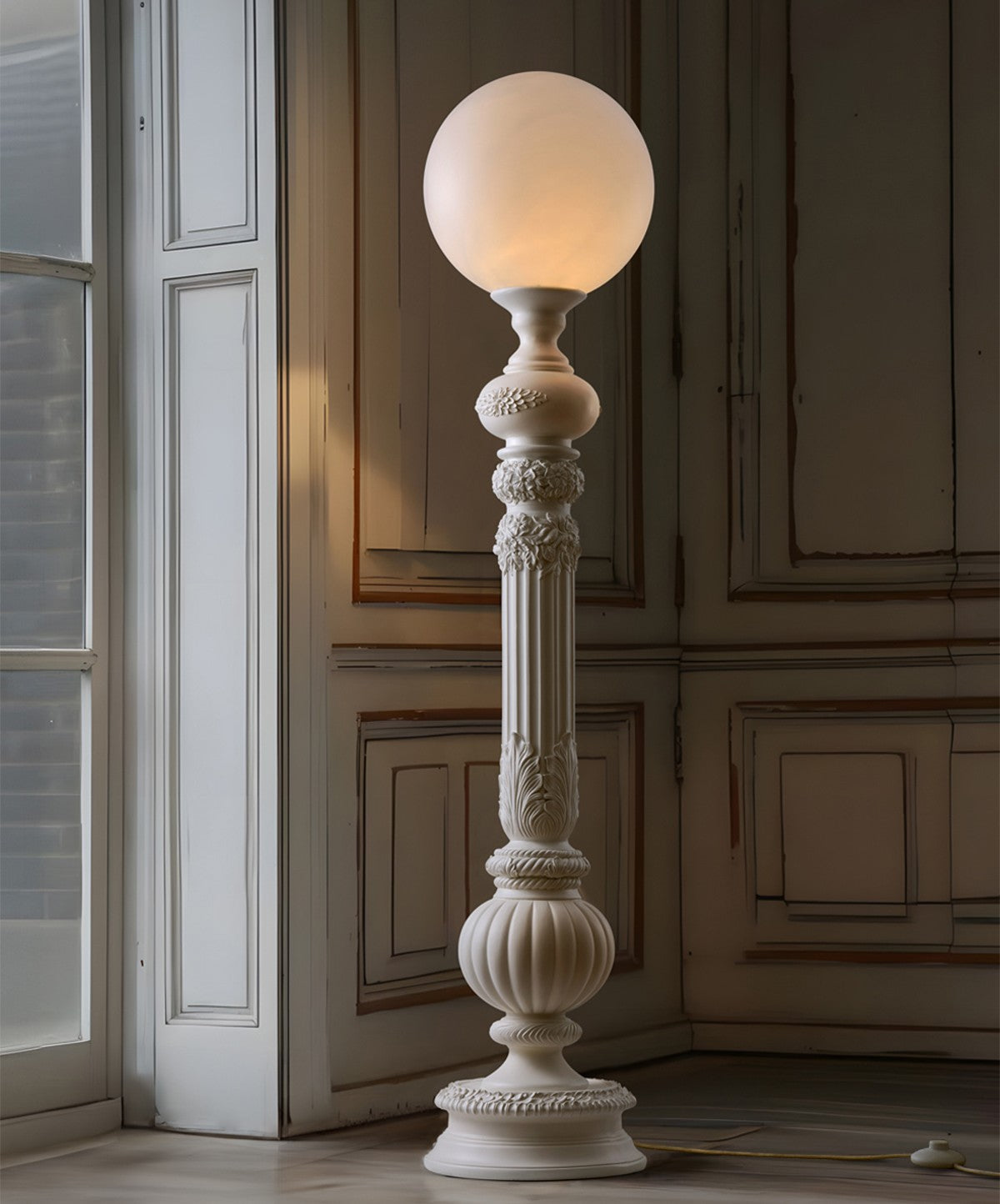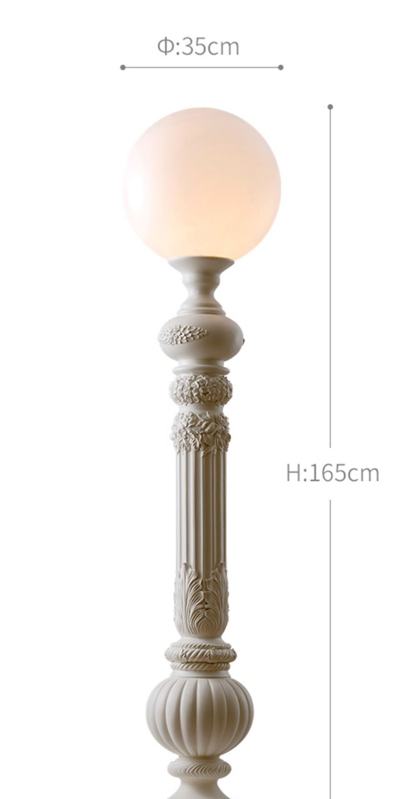 French Baroque Floor Lamp with Hand-Carved Column Base, Luxury Villa Living Room Statement Lighting with Globe Shade, Vintage Ornate Fireplace Accent Lamp