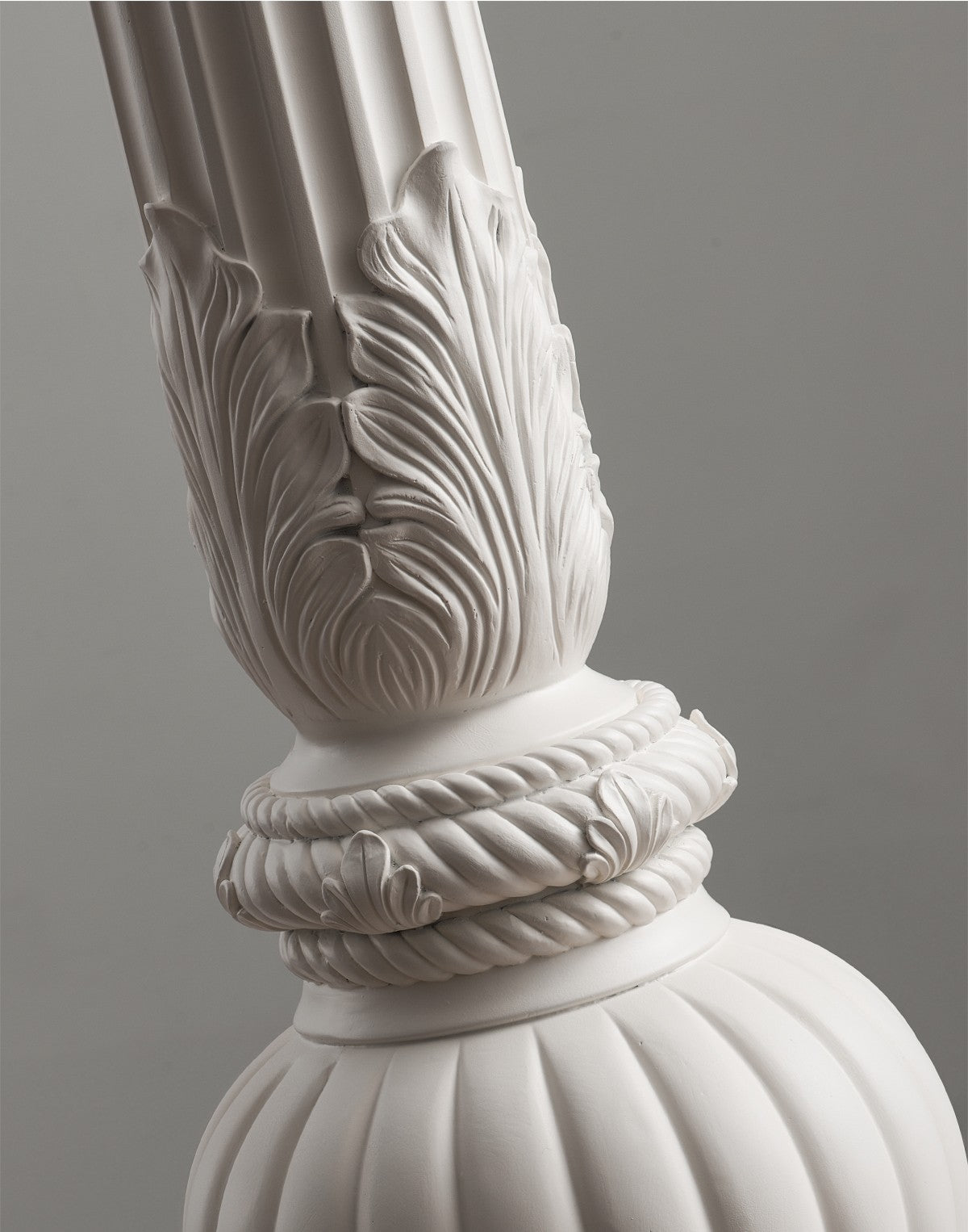 The elaborate column base displays multiple carved sections including intricate acanthus leaf motifs, twisted rope details, fluted columns, and ornate baroque flourishes that demonstrate exceptional craftsmanship. Each element is individually carved and finished in sophisticated chalk-white paint that highlights every detail while creating elegant contrast against the warm glow of the oversized globe shade.