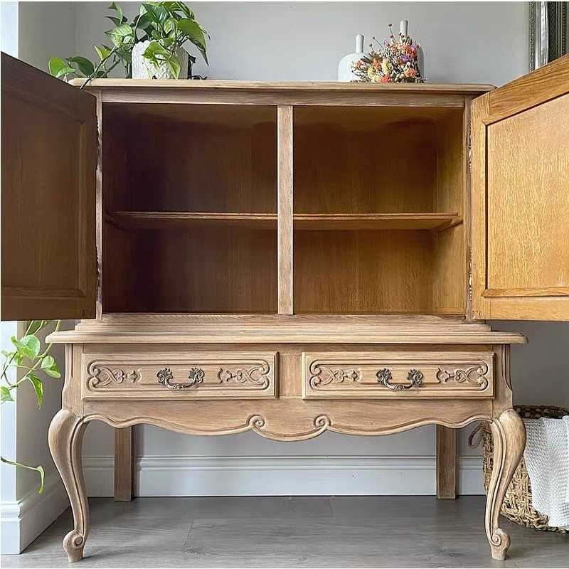 French Provincial Hand-Carved Hutch Cabinet with Curved Legs, Solid Wood Two-Door China Cabinet with Display Shelving, Custom Country Style Furniture