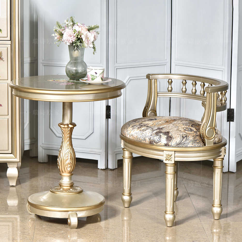 French Vintage Champagne Gold Tea Table & Chair Set – Classic Round Pedestal Table with Upholstered Accent Chair, Luxury Patio Conversation Furniture