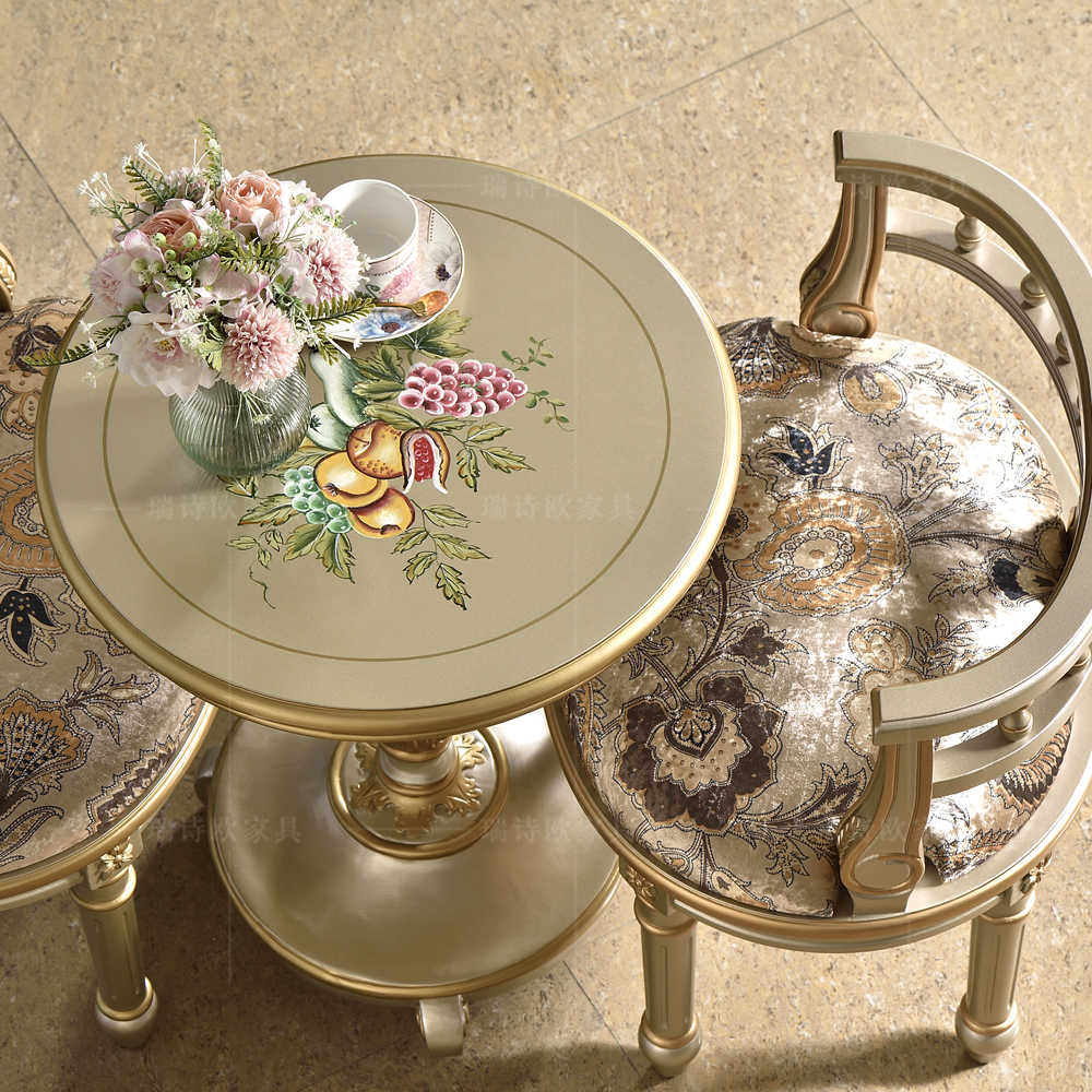 Create an enchanting conversation area with this French Vintage Champagne Gold Tea Table & Chair Set, where European elegance meets timeless craftsmanship in stunning furniture pieces. The 22-inch round pedestal table features a beautifully hand-painted tabletop showcasing delicate botanical motifs with fruits and flowers, rendered in soft pastels that evoke the romantic charm of French country estates. The champagne gold finish throughout both pieces creates a warm, luxurious patina that catches light beautifully while the ornately carved pedestal base demonstrates exceptional woodworking artistry. The companion accent chair features graceful curved arms, decorative spindle back, and sumptuous paisley-patterned upholstery that provides comfortable seating while maintaining the set's sophisticated aesthetic. Perfect for creating intimate tea settings, balcony conversation areas, or luxury accent pieces in bedrooms and sitting rooms, this exquisite set brings the refined elegance of French château style to contemporary homes while offering the practical functionality needed for daily enjoyment.