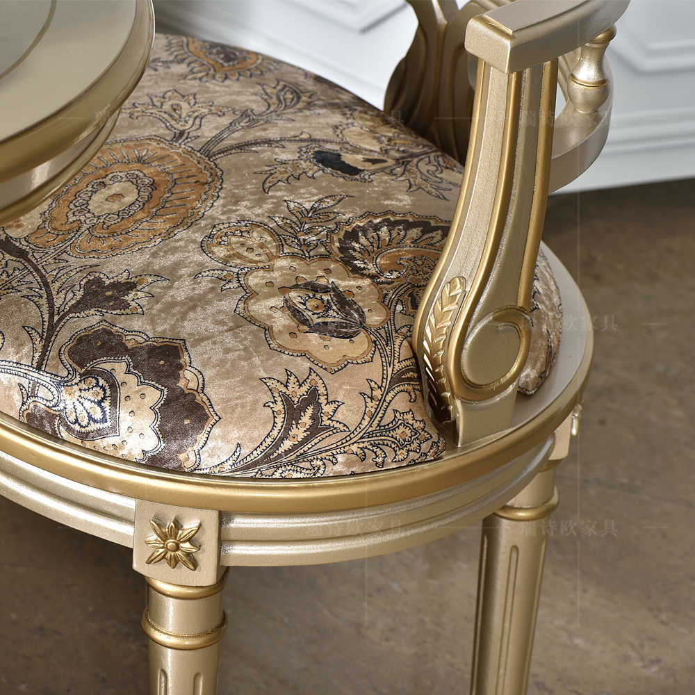 Elegant champagne gold finish on solid wood frame creates luxurious French vintage aesthetic perfect for upscale interiors and outdoor spaces.