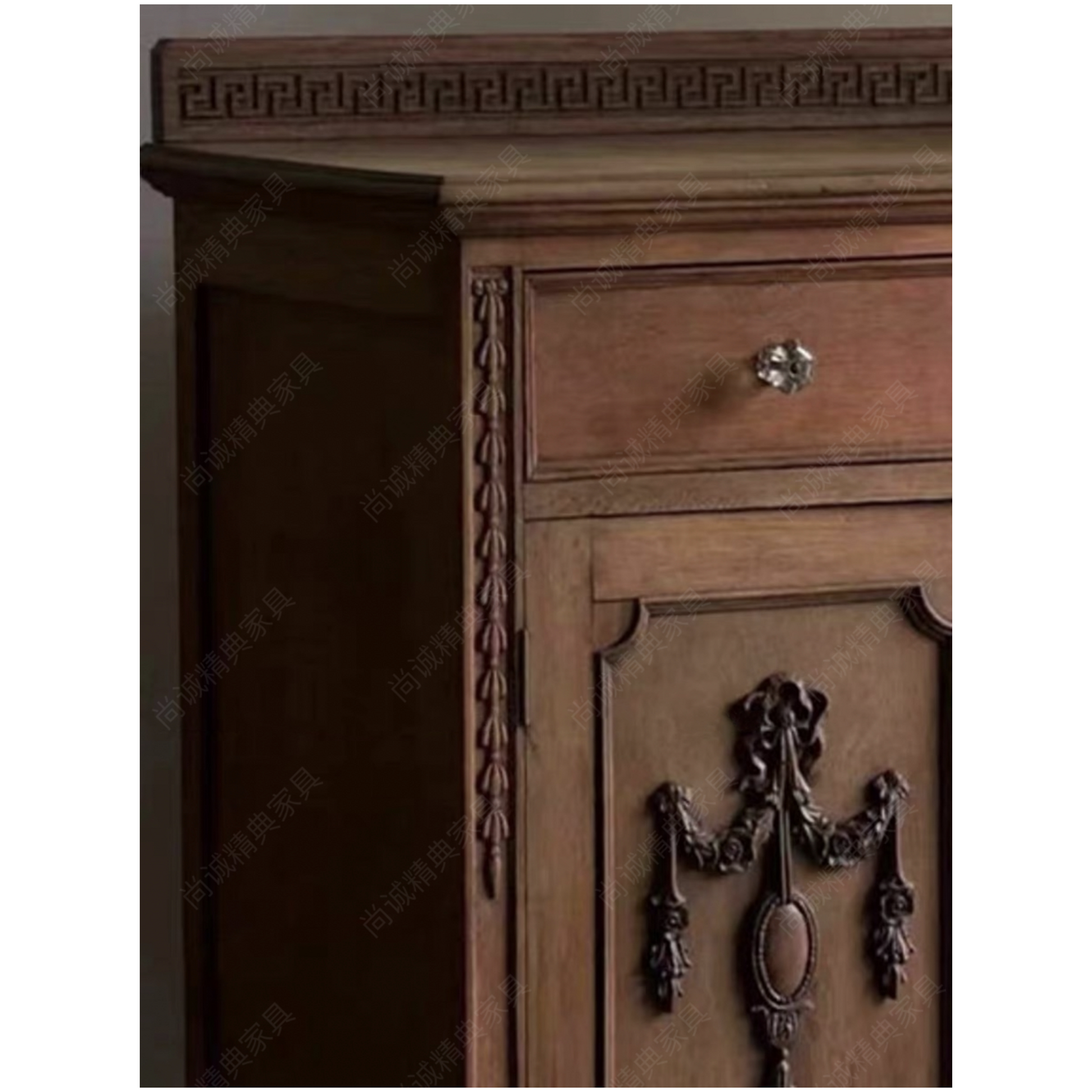 Greek Key Crown Molding: Traditional meander pattern border symbolizes infinity and eternal flow while adding sophisticated architectural detail that defines authentic French furniture design.