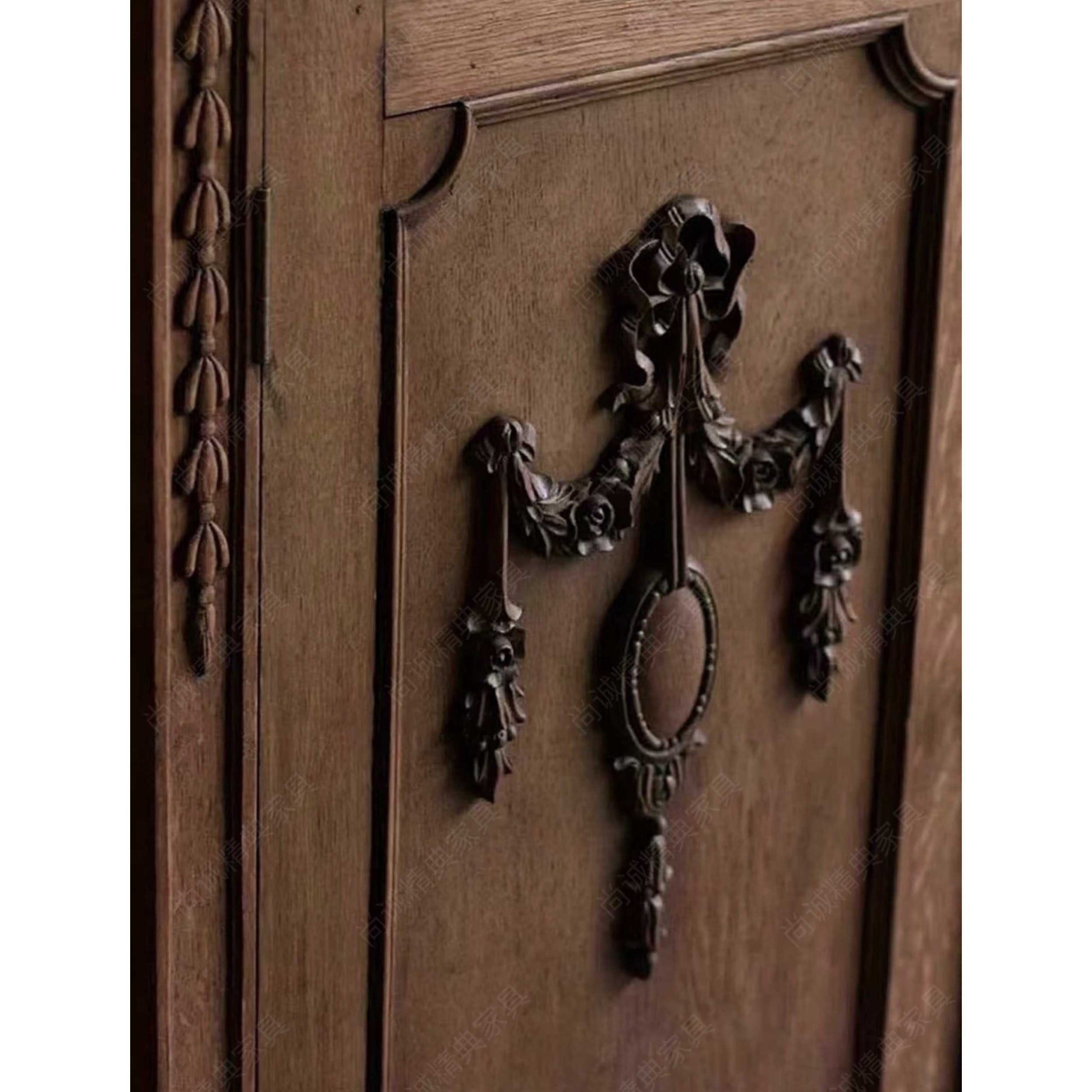 The premium solid wood construction showcases expert hand-applied distressing that creates authentic patina reflecting generations of French manor house character. The ornate bronze-finished hardware featuring classical urns and floral garlands demonstrates museum-quality attention to period-appropriate detailing.