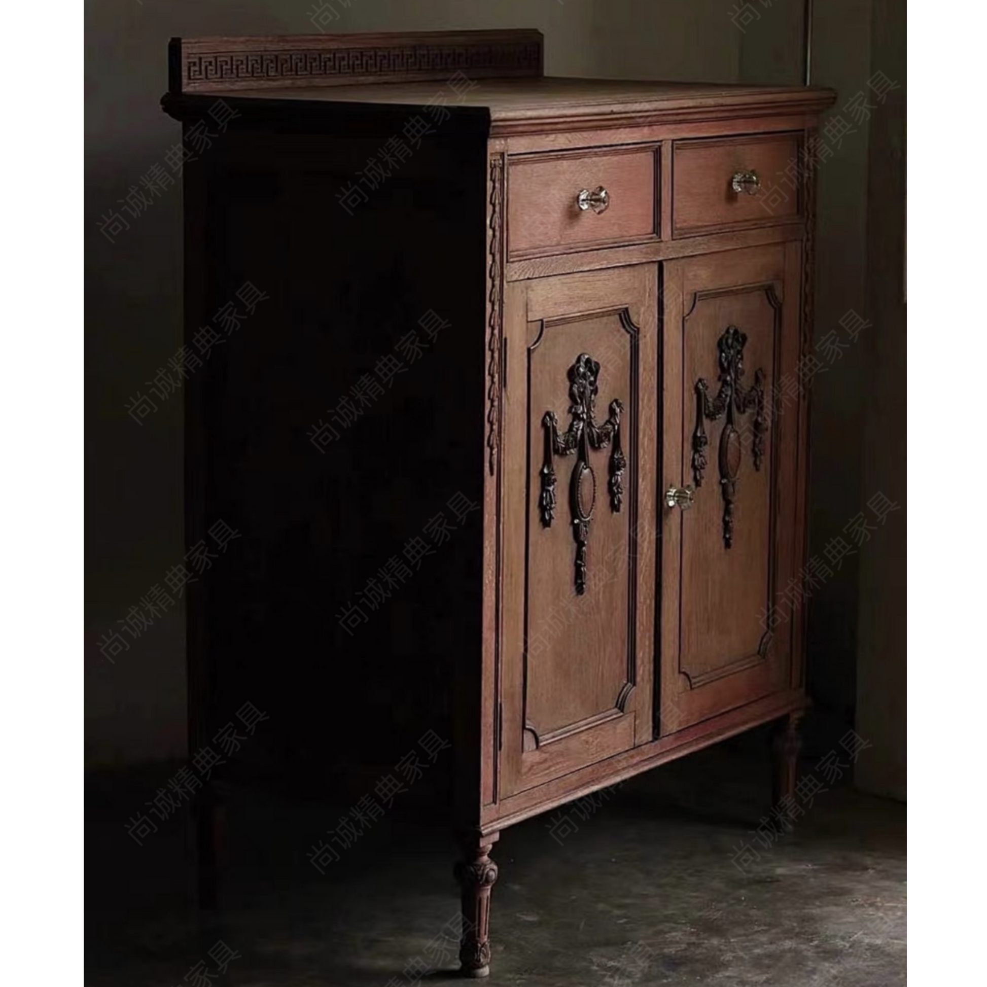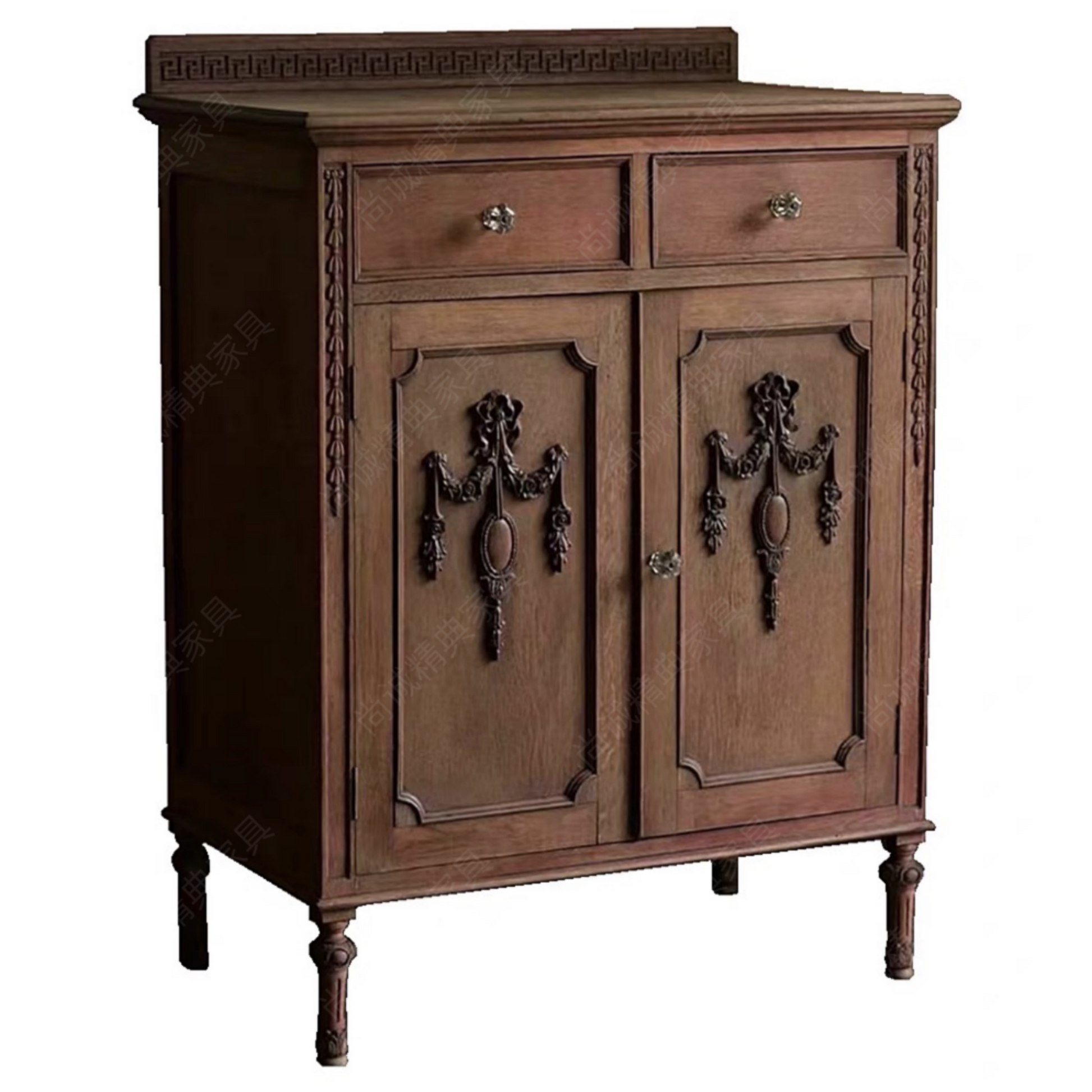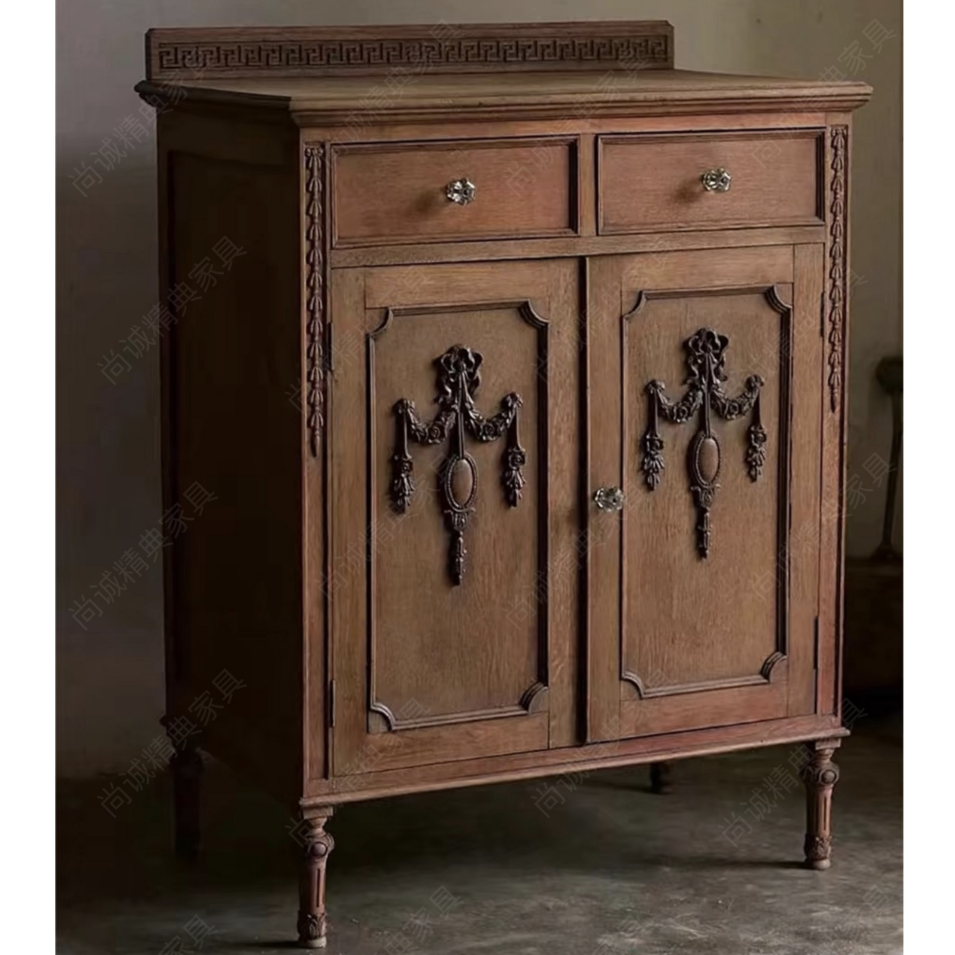 French Vintage Solid Wood Sideboard with Greek Key Pattern & Ornate Metal Swags, Louis XVI Style Storage Cabinet with Turned Legs