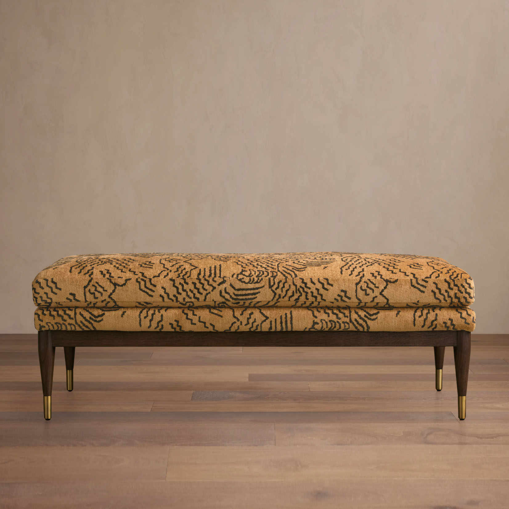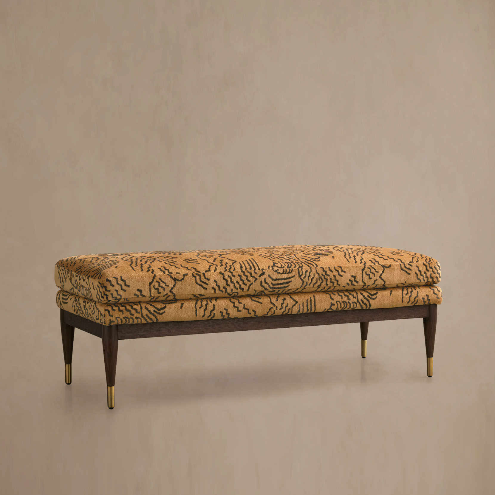 French Vintage Tiger Mountain Pattern Bench, Designer Hotel-Style End-of-Bed Bench with Dark Wood Frame, Mid-Century Long Upholstered Ottoman