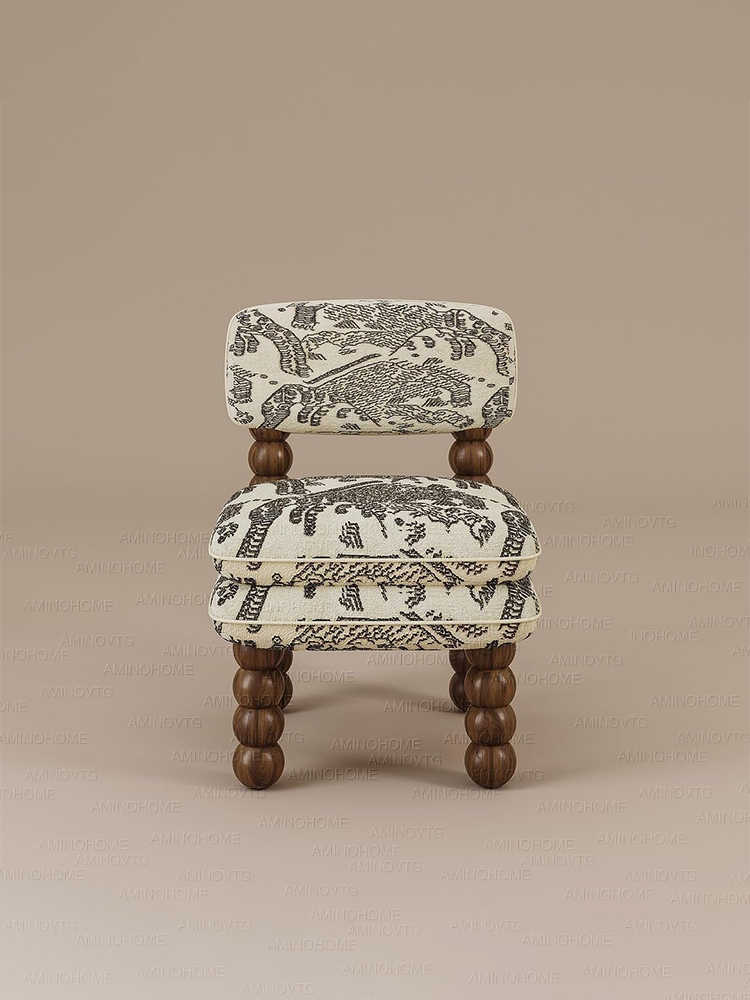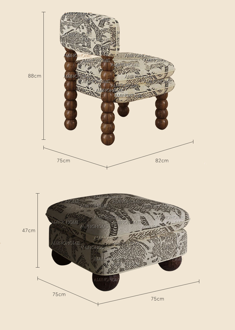 French Vintage Tiger Mountain Pattern Dining Chair with Bobbin Legs, Traditional Upholstered Armchair with Ottoman Set