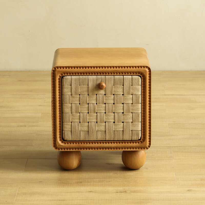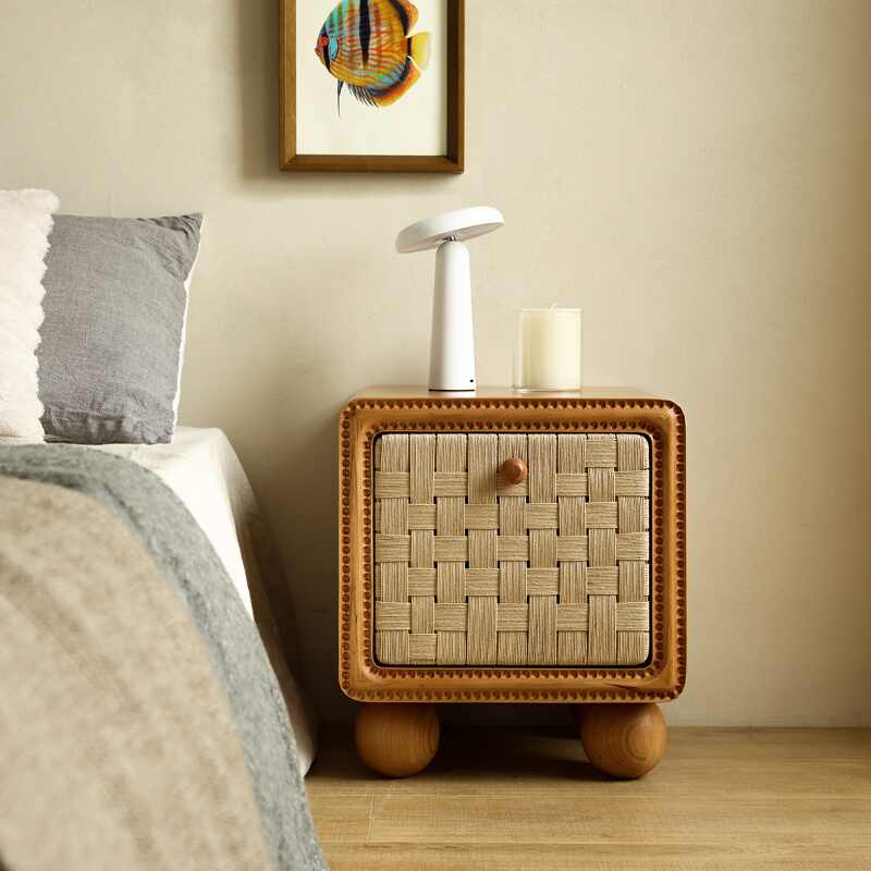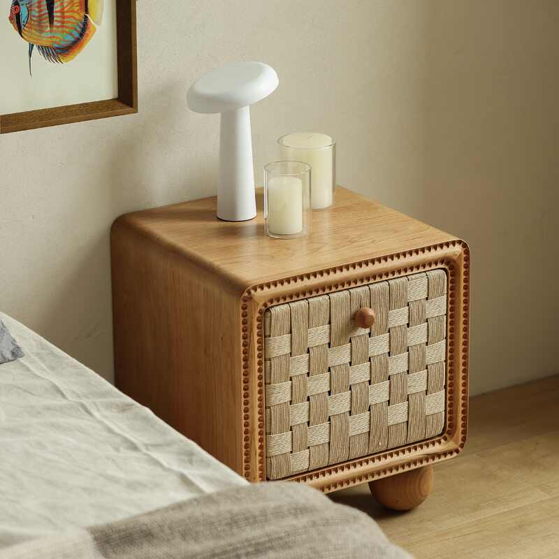 French Vintage Woven Nightstand – Handcrafted Basket-Weave Storage Cabinet with Rounded Wood Frame, Contemporary Bedroom Furniture