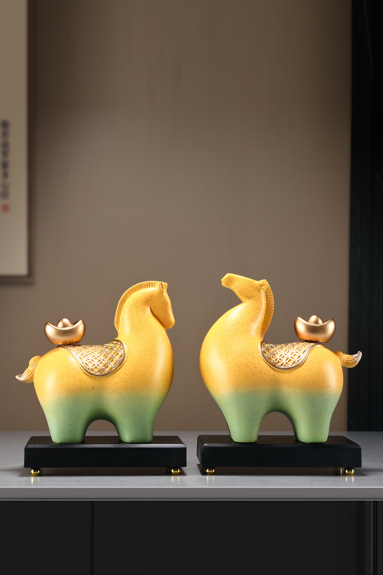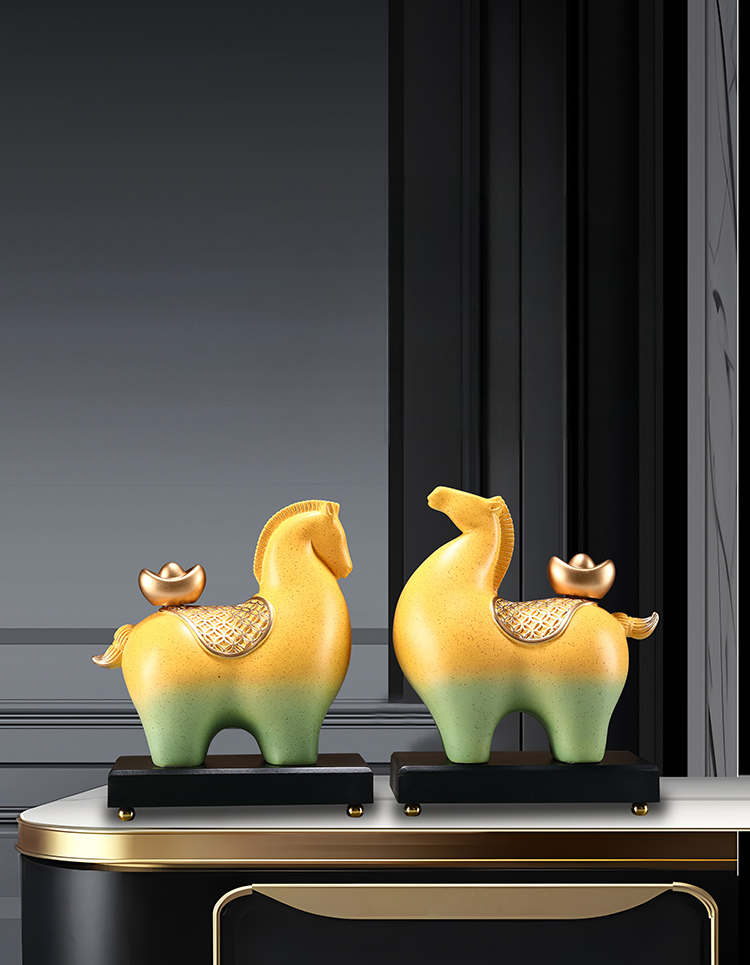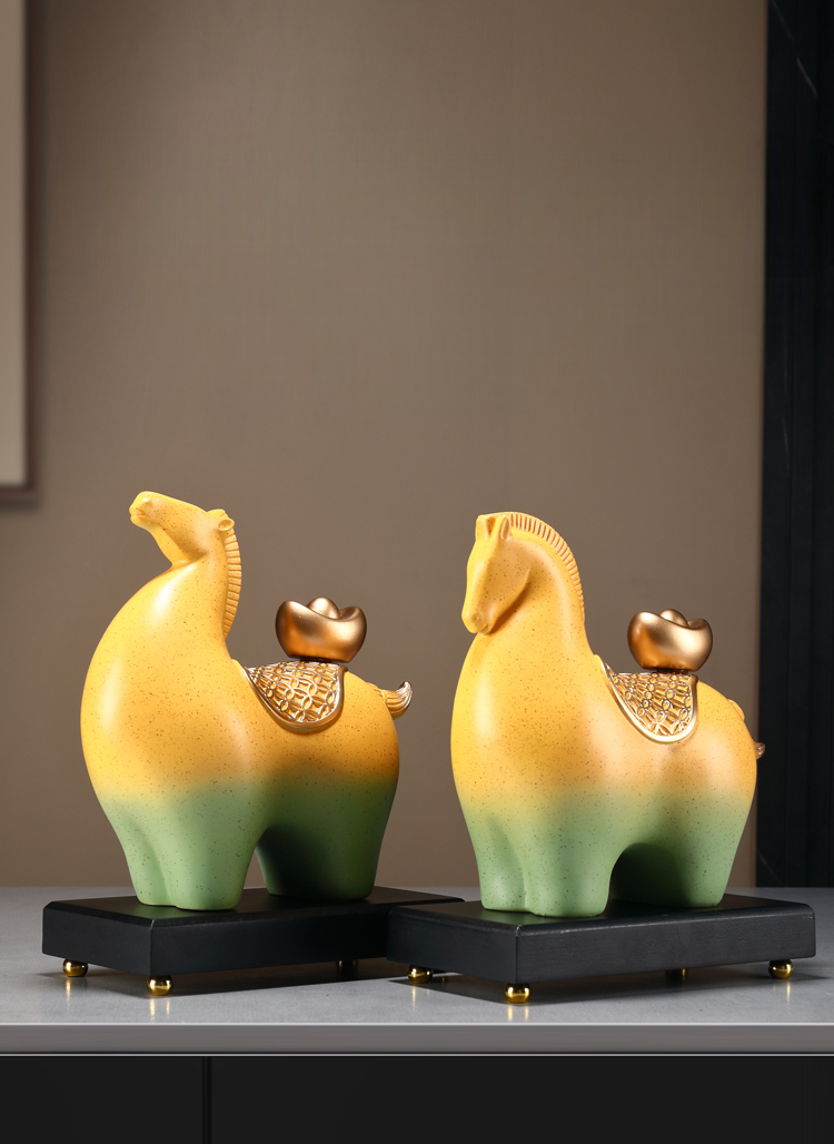 The Galloping Success horse sculptures feature an uplifting, contemporary design with a lustrous gold saddle ingot, blending green and yellow finishes for prosperity and style. These elegant pieces (22.5 cm and 22 cm tall) anchor mantels, shelves, and counters, embodying the wish for smooth success and abundant fortune—perfect as thoughtful gifts or signature décor in homes and business settings.