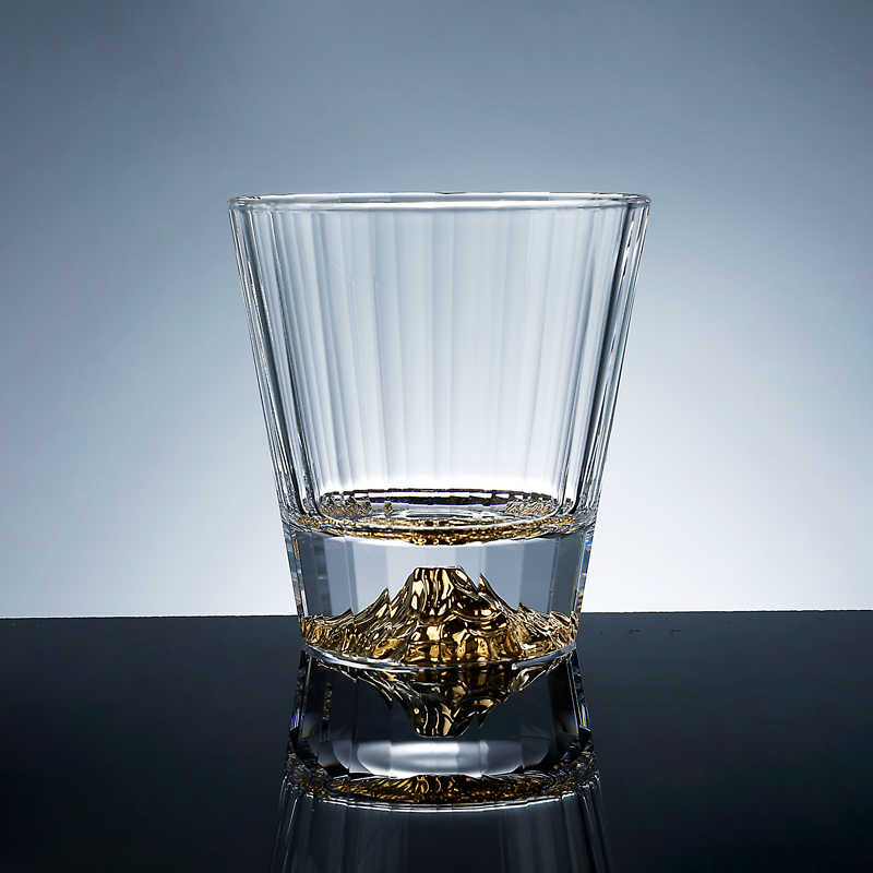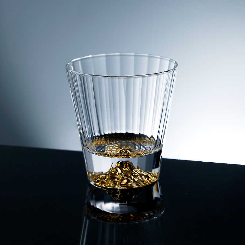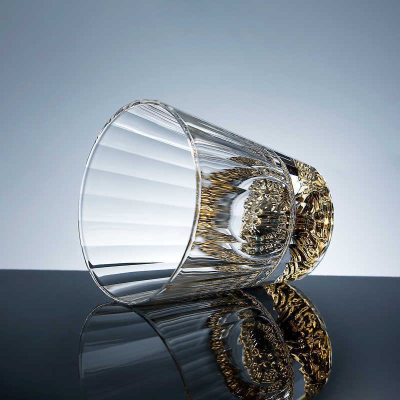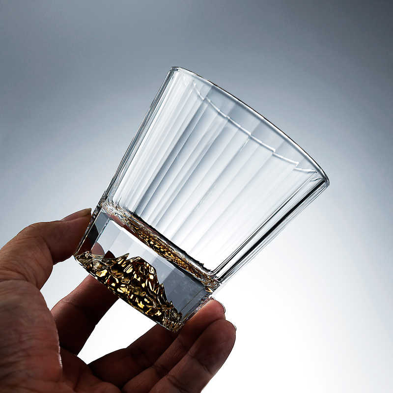 Premium crystal glass whiskey tumbler featuring elegant vertical ridged design with stunning gold mountain base accent for sophisticated drinking experience.Wide rim opening enhances aroma release while the 250ml capacity is perfect for whiskey, bourbon, scotch, cocktails, and premium spirits.