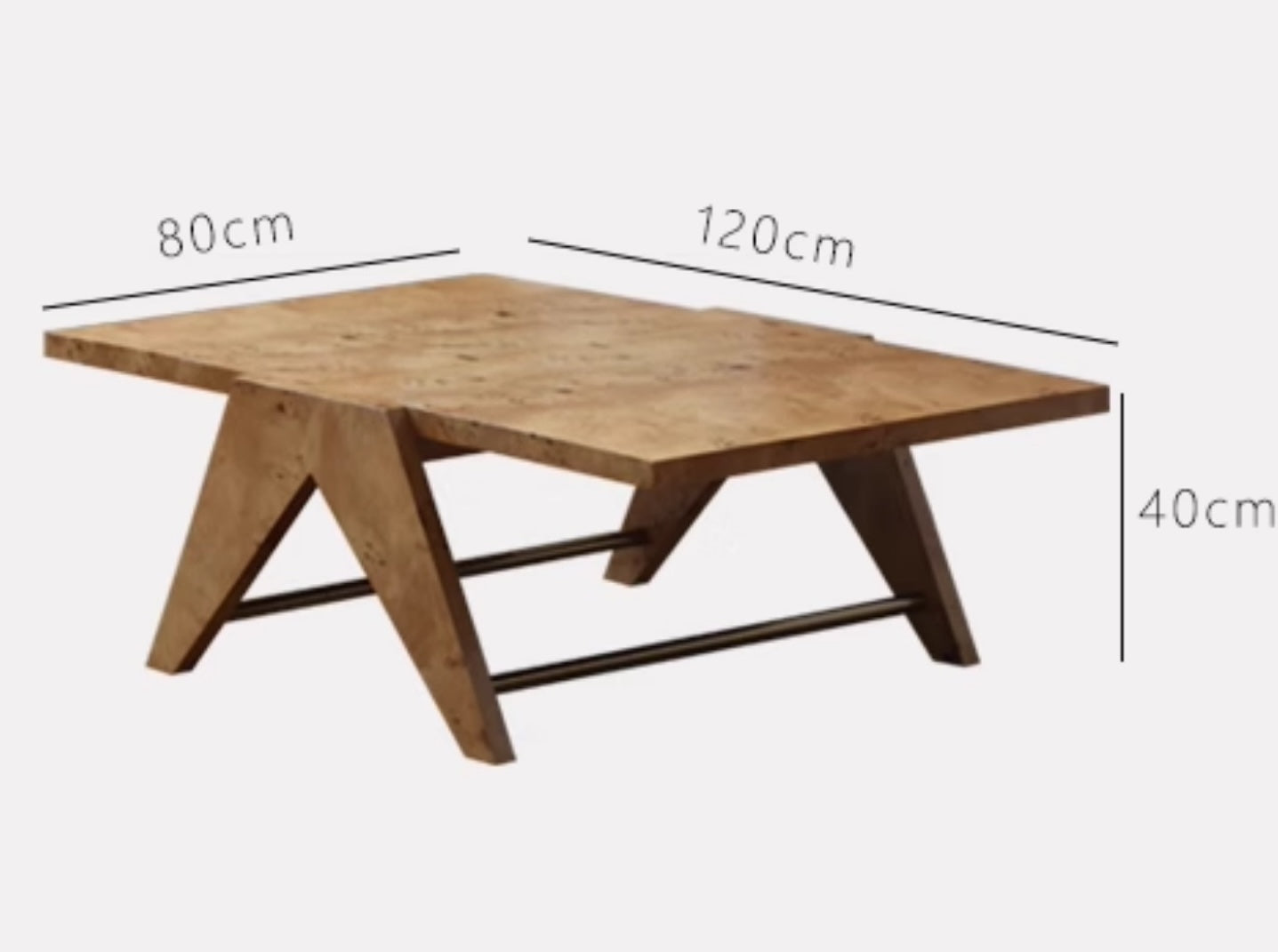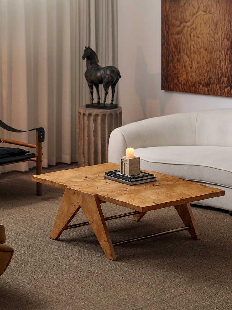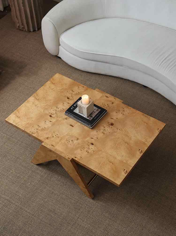 Transform your living space with this extraordinary Golden Burl Wood Coffee Table, a masterpiece that celebrates the rare beauty of natural tree burl wood through sophisticated Chandigarh-inspired design. Measuring 120x80x40cm, this substantial rectangular coffee table showcases the mesmerizing golden grain patterns and distinctive swirls that make burl wood one of nature's most prized materials. The special tactile finish enhances the wood's natural texture while providing a smooth, skin-friendly surface that invites touch and admiration. The striking A-frame base design draws inspiration from mid-century architectural movements, creating clean geometric lines that perfectly complement the organic beauty of the burl wood top. This substantial coffee table provides generous surface space for entertaining, displaying books and décor, or simply enjoying daily living while serving as a stunning conversation piece. The angular wooden legs ensure exceptional stability while maintaining visual lightness that prevents the piece from overwhelming your space. Each table is unique due to the natural variations in burl wood grain, making your piece truly one-of-a-kind. Perfect for contemporary, mid-century modern, Scandinavian, or eclectic interiors, this coffee table bridges the gap between functional furniture and sculptural art. The premium construction and timeless design ensure this piece will be treasured for generations while the exotic burl wood continues to develop character and beauty over time.