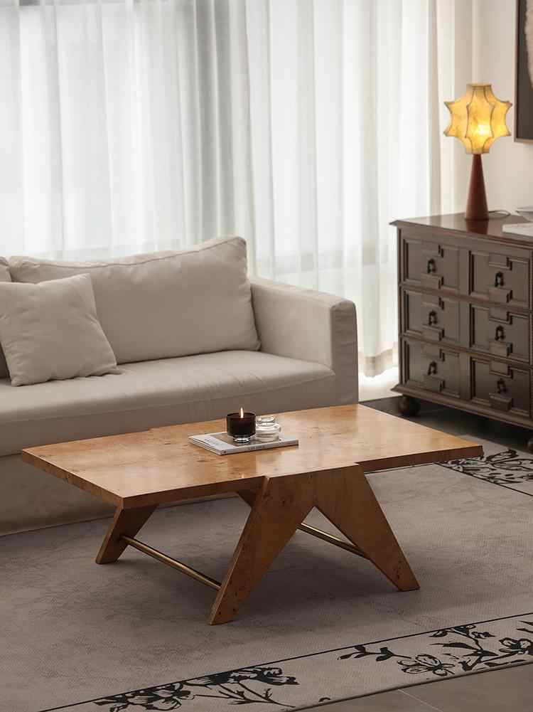 Golden Burl Wood Coffee Table – Chandigarh Style Designer Rectangular Low Table, Natural Tree Burr Grain Living Room Coffee Table, Mid-Century Modern Furniture