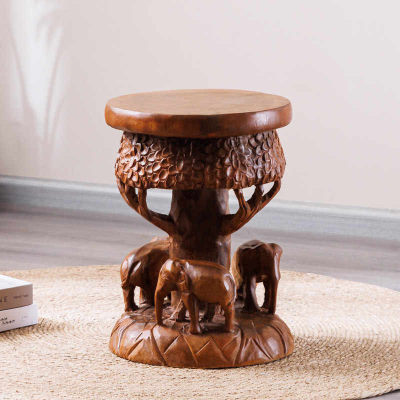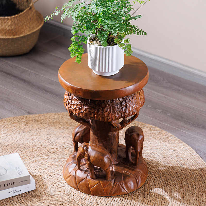 Hand-Carved Thai Solid Wood Elephant Stool, Creative Animal Accent Seat, Decorative Shoe Bench Plant Stand