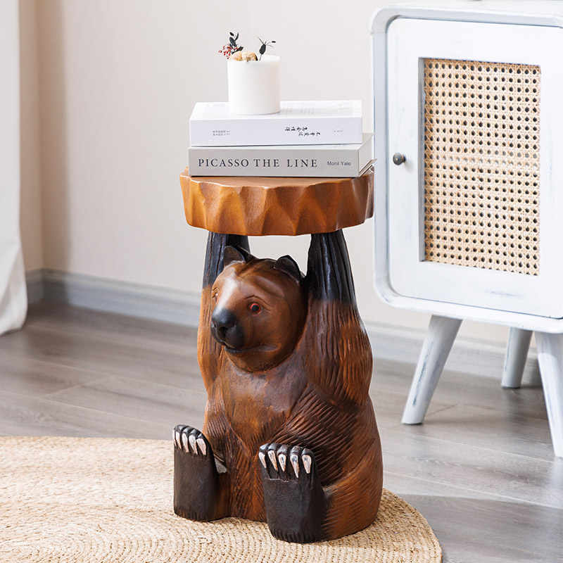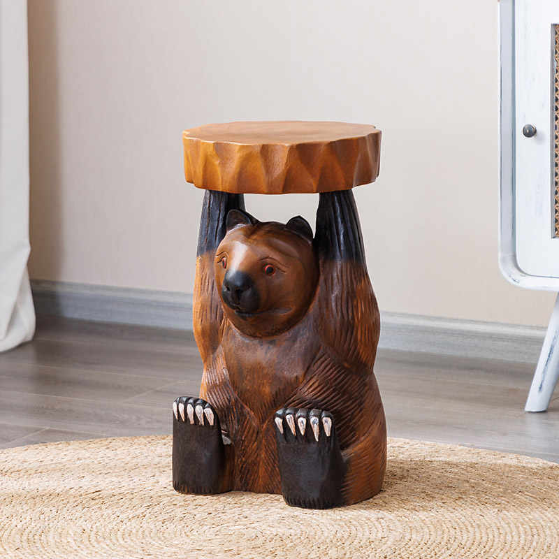 Hand-Carved Wooden Bear Stool with Tree Stump Base, Rustic Animal Accent Table for Entryway Shoe Change & Plant Stand,