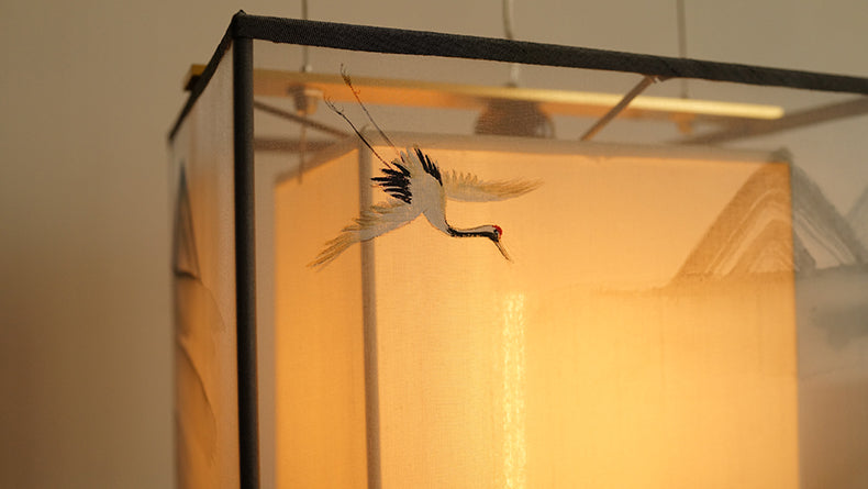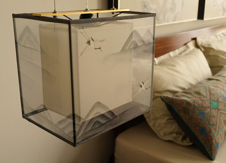 Modern square pendant light featuring hand-painted crane and misty mountain landscape, blending minimalism with classic Asian art for a calming ambiance.