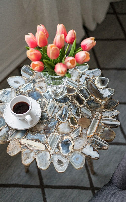 Material: Hand-inlaid agate stone tabletop, aluminum, gold-tone metal legs