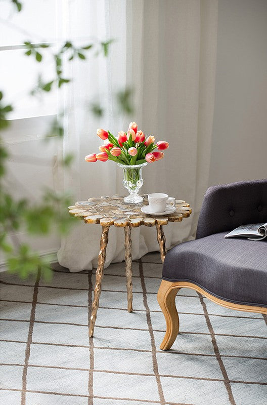 Elevate living spaces with the large gold agate side table—an exclusive designer piece featuring a broad, hand-inlaid agate stone top in gold hues and sculptural aluminum legs. Measuring 46 x 48 cm, it offers ample surface for books, vases, coffee, or decorative arrangements, while each natural stone top displays individual veins and coloration. The gold-finished metal legs are artfully twisted for added sculptural interest and ensured stability, making this side table not just a functional accent but a genuine art object for showrooms, stylish homes, or boutique lounges seeking global sophistication and natural luxury .