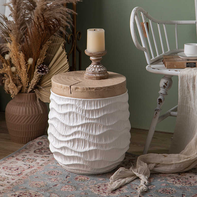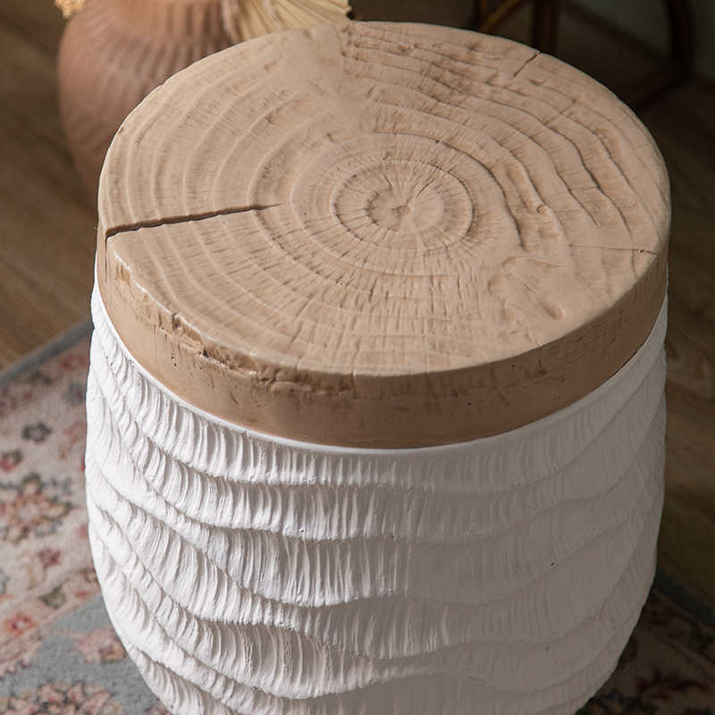 Handcrafted Rope-Textured Ceramic Side Table, Rustic Round Storage Stool with Natural Wood Top, Boho Living Room Accent Table,