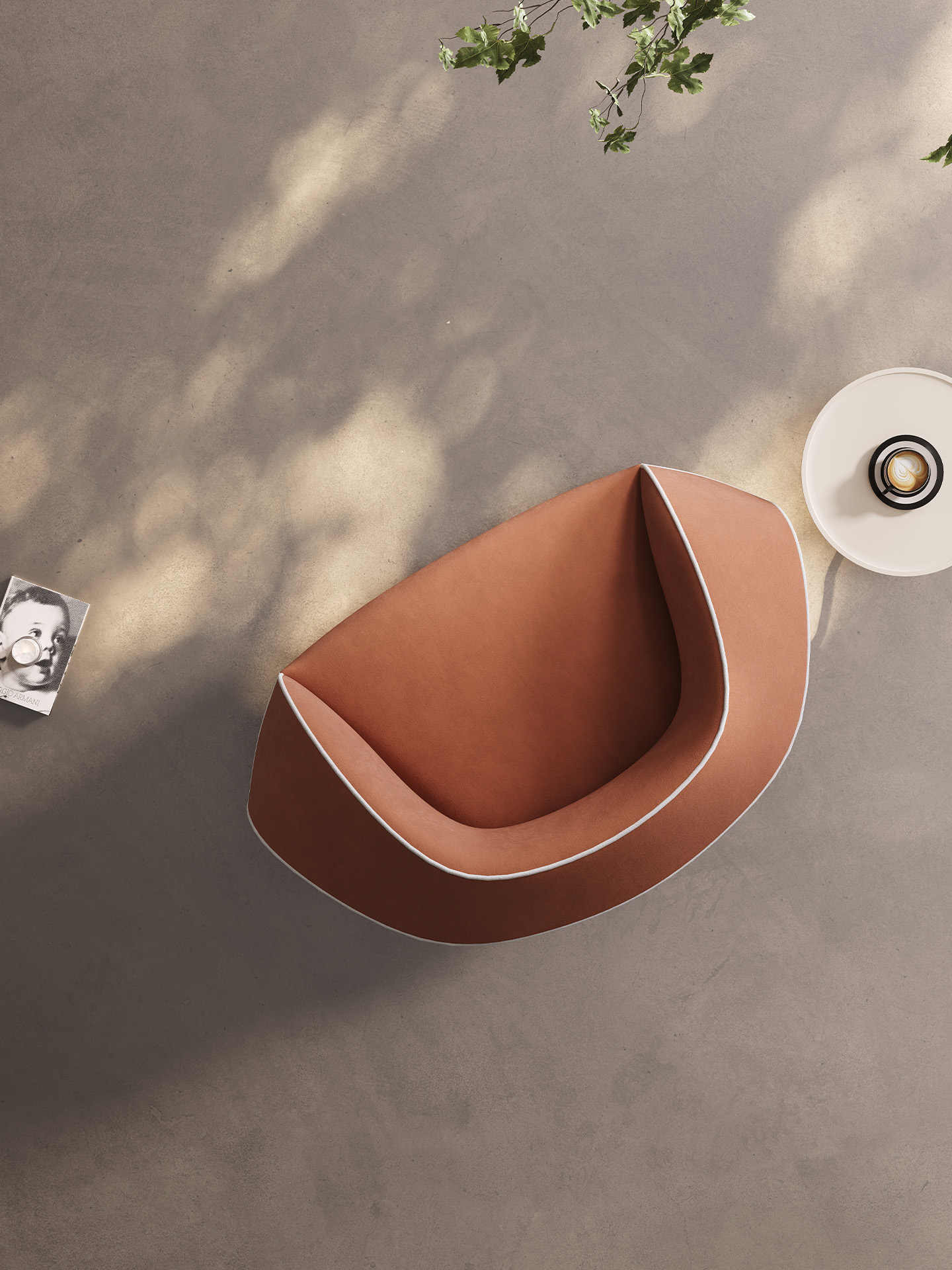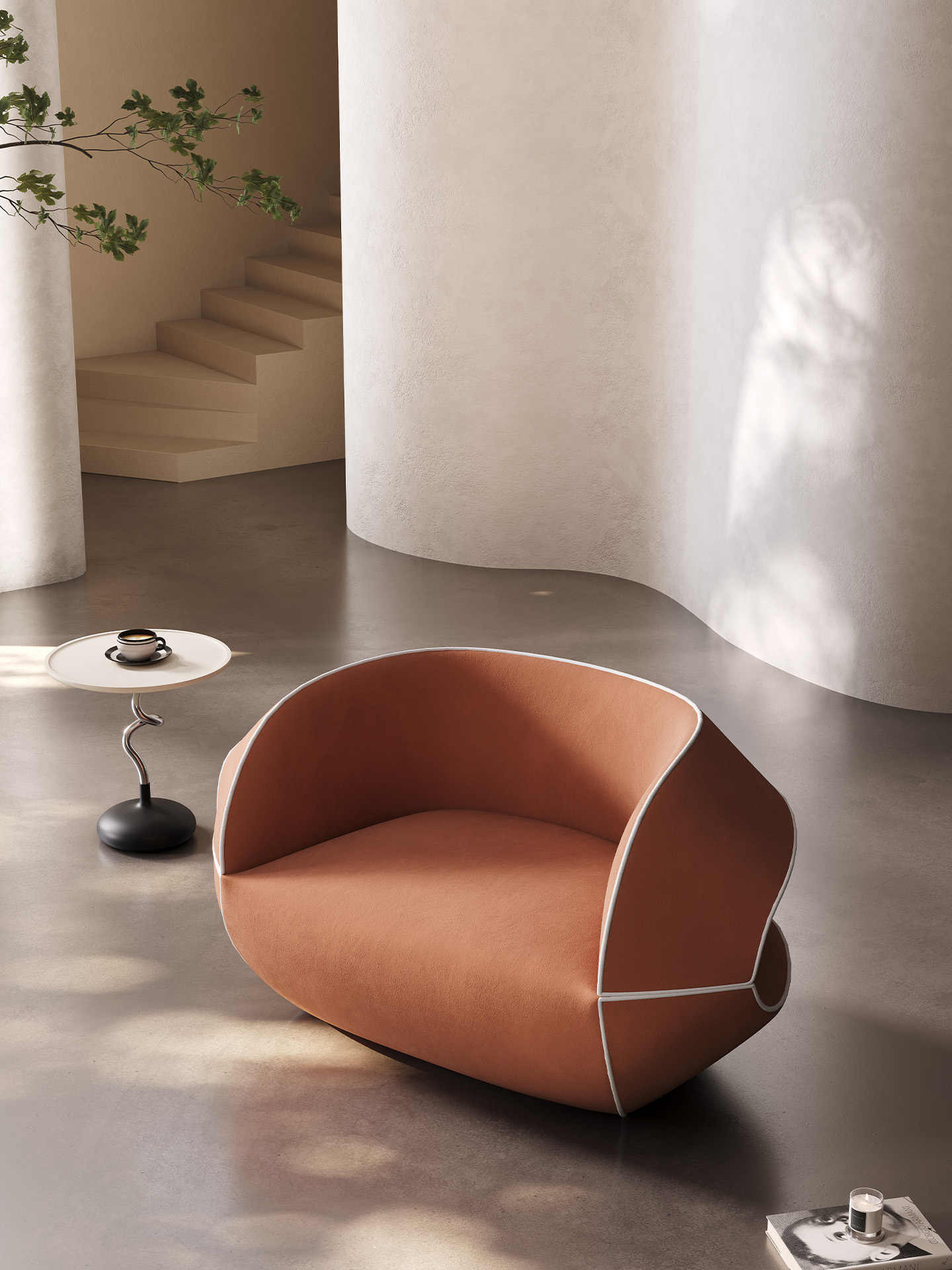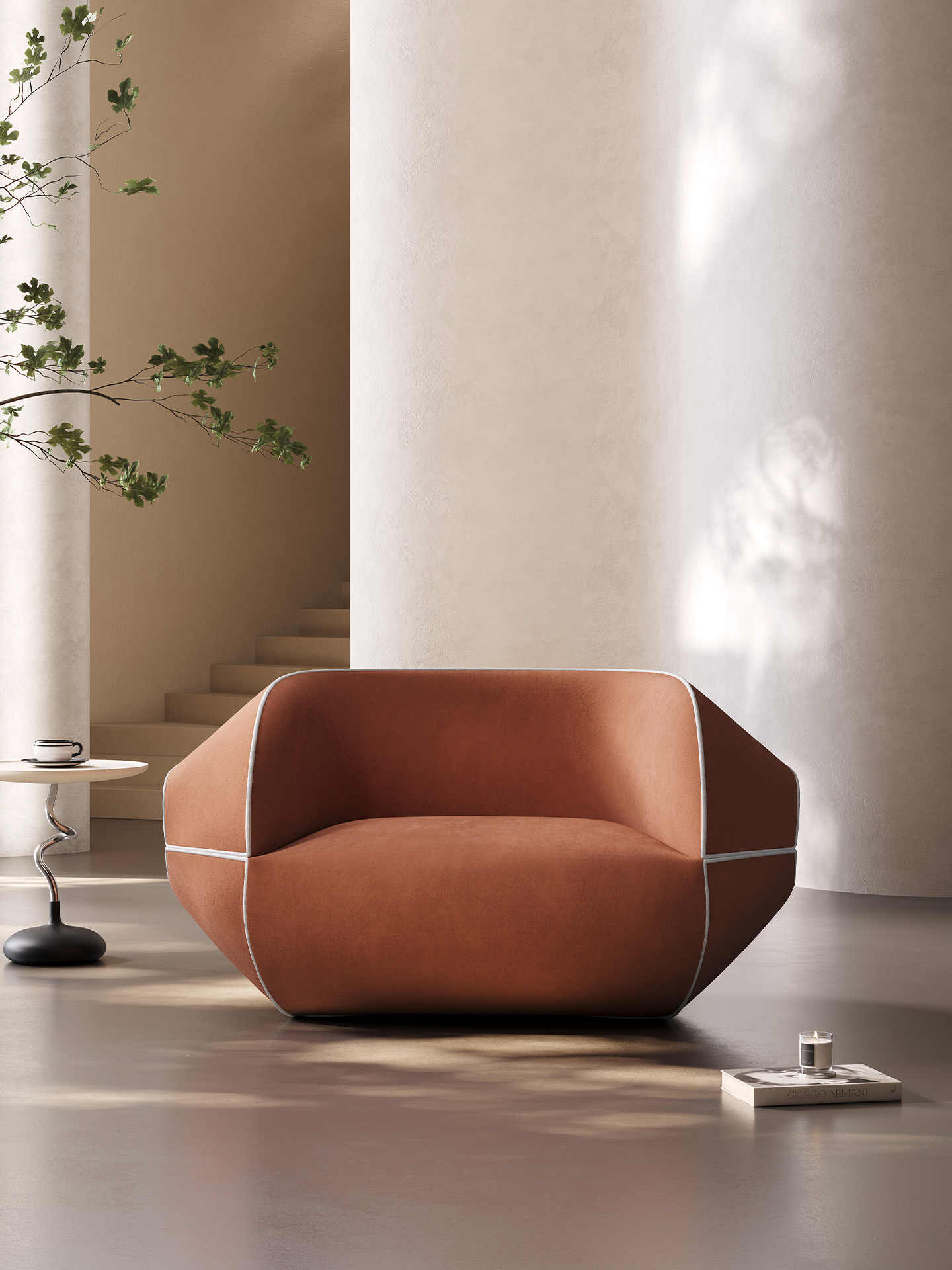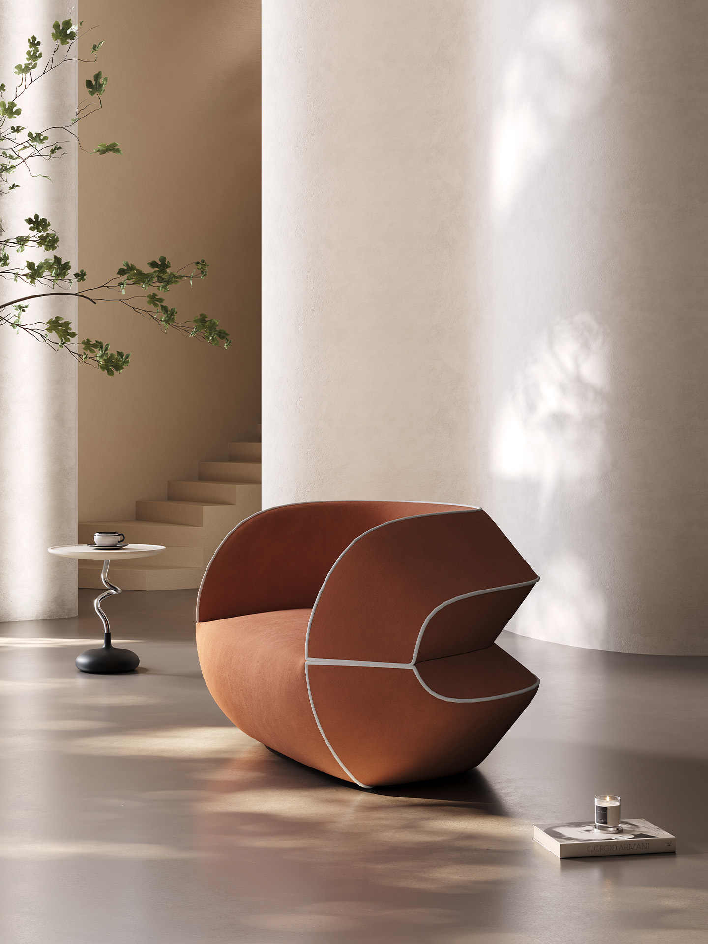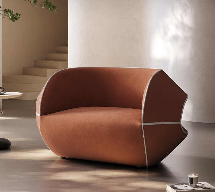 Sophisticated terracotta upholstery in premium fabric with elegant white contrast piping defining the architectural curves and edges.