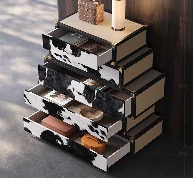 Transform your interior into Italian luxury villa with this Cowhide Chest of Drawers, where authentic post-modern design meets exceptional craftsmanship through premium natural materials. The striking cowhide upholstery creates stunning visual statement while providing sophisticated storage solutions.
