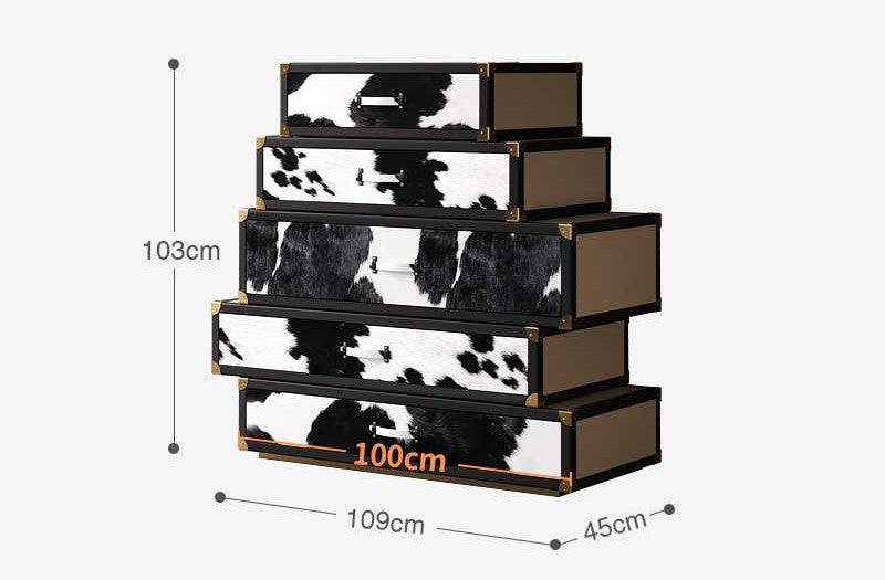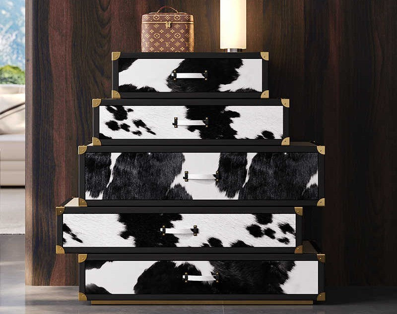The genuine cowhide patterns showcase natural beauty while the brass corner hardware adds warm metallic sophistication. The five-drawer system provides extensive organized storage while the soft-close mechanisms ensure whisper-quiet operation and lasting durability.