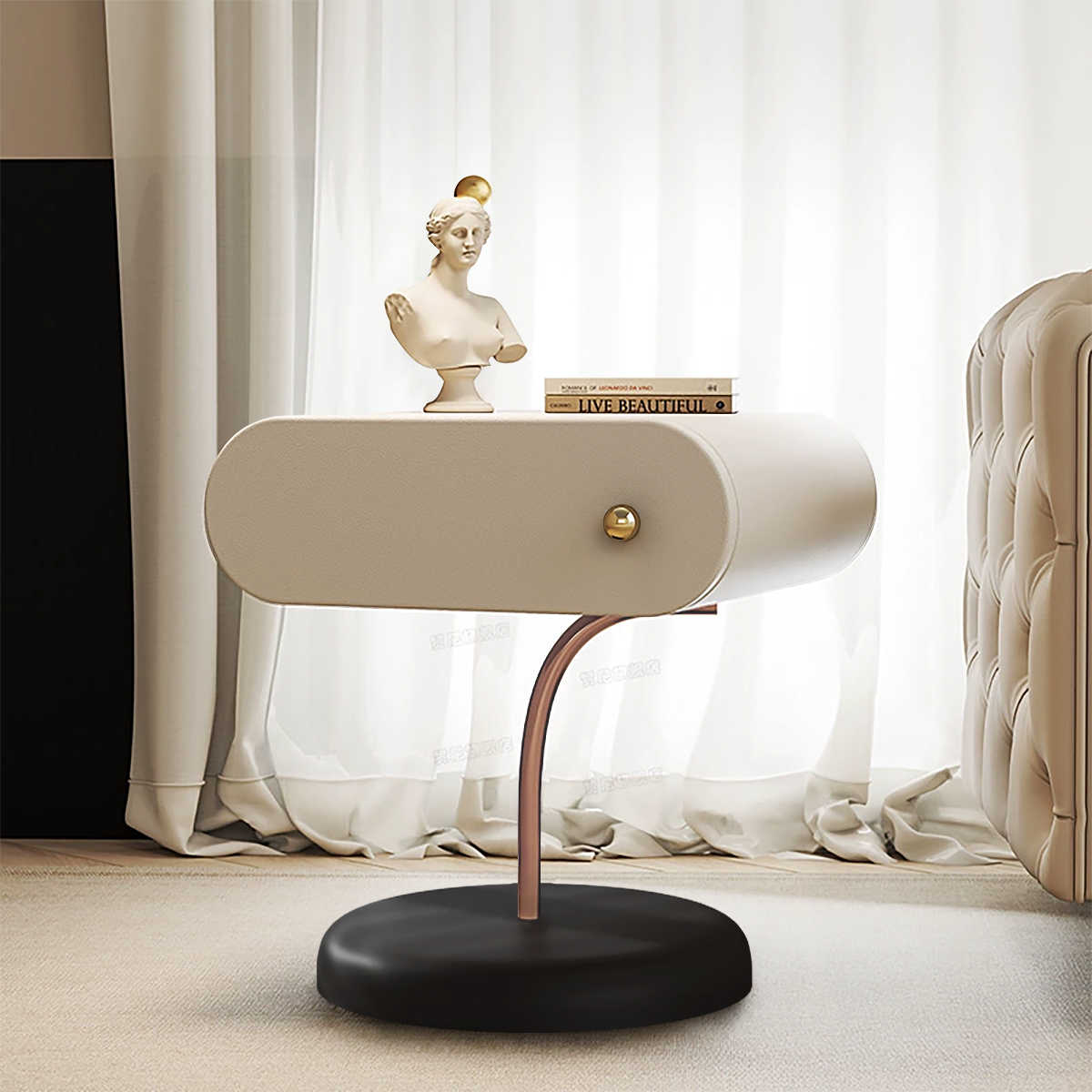 Elevate your interior with this stunning Italian Minimalist Cream Nightstand, a masterpiece of contemporary design that combines luxury aesthetics with functional sophistication. Measuring 40-48x40x50cm, this unique side table features an extraordinary curved tubular construction in elegant cream finish that creates a striking sculptural presence in any room. The innovative design includes a seamlessly integrated hidden drawer with premium golden hardware, providing discreet storage while maintaining the piece's clean, uninterrupted lines. The distinctive curved bronze metal support leg adds architectural drama while ensuring exceptional stability and visual lightness. This versatile accent piece works beautifully as a bedside nightstand in modern bedrooms, a statement side table in luxury living rooms, or as a designer accent piece in boutique hotels and contemporary spaces. The premium cream finish offers timeless sophistication that complements minimalist, Scandinavian, modern, and transitional interior styles. The space-efficient design maximizes functionality without overwhelming smaller spaces, while the artistic curved form transforms practical furniture into a conversation-starting design element. Perfect for design enthusiasts who appreciate Italian craftsmanship, innovative forms, and the refined elegance of luxury contemporary furniture that bridges the gap between art and function.