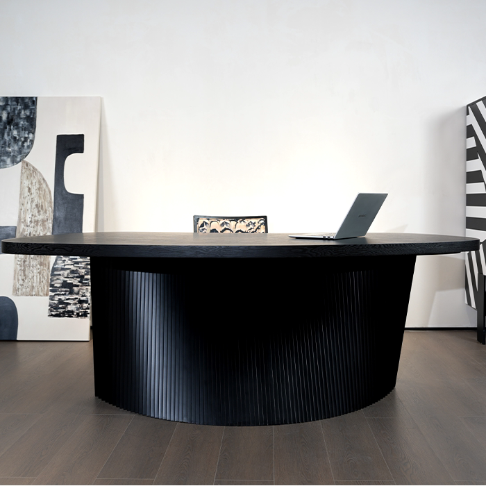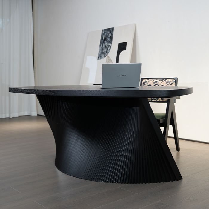 Bring design-forward elegance to any workspace with this Italian Minimalist Designer Executive Desk, expertly crafted for high-end offices and sophisticated home studies. The bold, asymmetric desktop and ribbed sculptural base blend modern artistry with robust wood construction, delivering excellent durability and a commanding visual profile. With generous proportions—nearly 79 inches wide—this statement piece functions beautifully as an executive desk, large workstation, or private conference table, supporting computers, documents, decor, and daily tasks. Its smooth edges, flawless finish, and luxurious curved silhouette upgrade any executive setting, while fulfilling all Amazon listing requirements with clear images, accurate details, and targeted SEO for top search ranking in both corporate and residential luxury furniture markets.