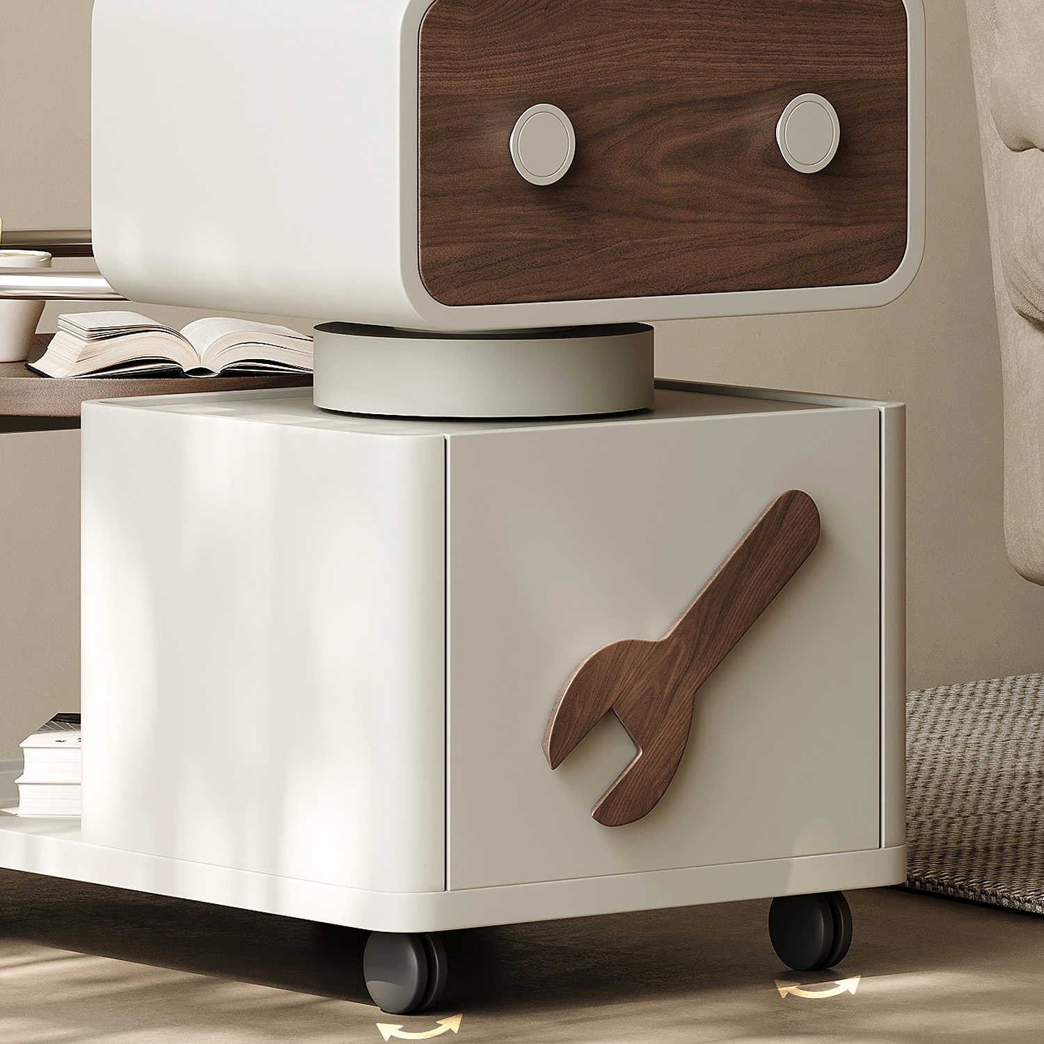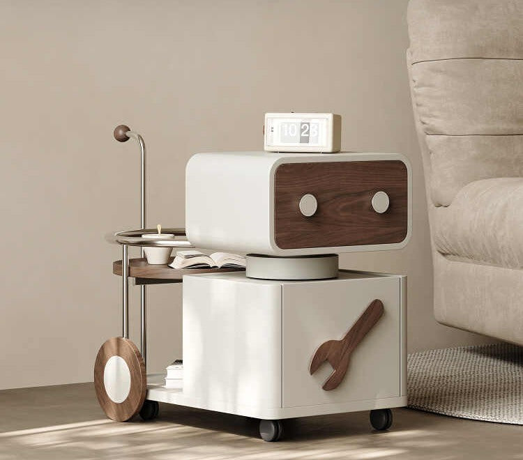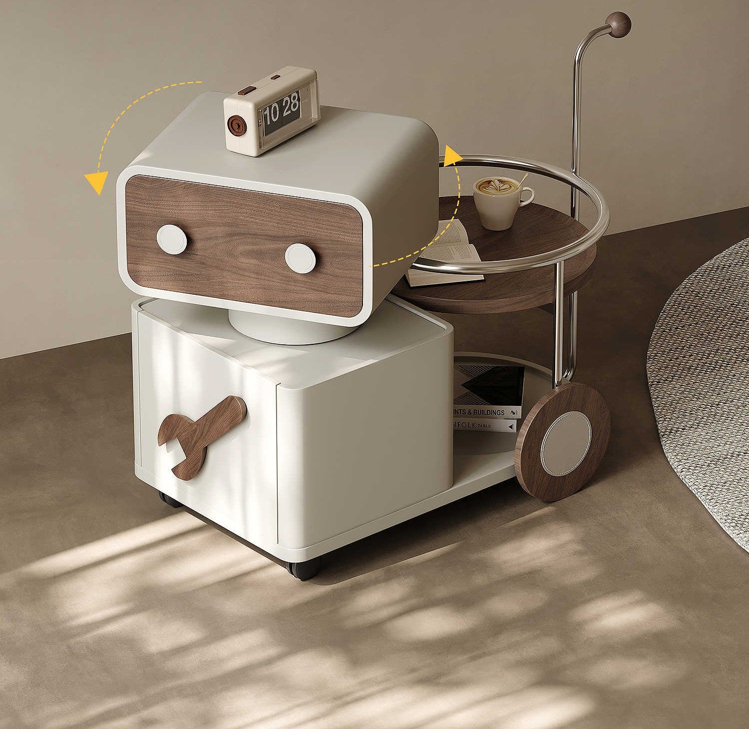 Elevate small-space living with the 2025 Italian Movable Sofa Side Table, a visionary cabinet that blends playful robot aesthetics with practical versatility. Featuring a unique rotating-head design, dual drawers, and spacious cabinet storage, it provides optimal organization for books, electronics, and household items—keeping the living area tidy and stylish. The robust engineered wood construction and chic walnut details ensure lasting quality, while metal wheels and a smooth handle allow effortless movement throughout the home. The multifunctional removable tray is perfect for serving beverages or snacks, and the integrated shelf expands usable space for magazines and décor. Ideal for modern apartments or studio layouts, this creative side cabinet adapts as a bedside table, tea cart, or living room accent to suit ever-changing daily needs.