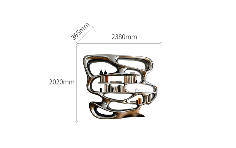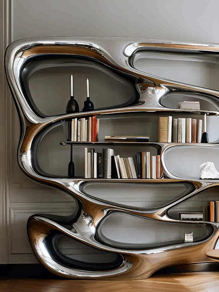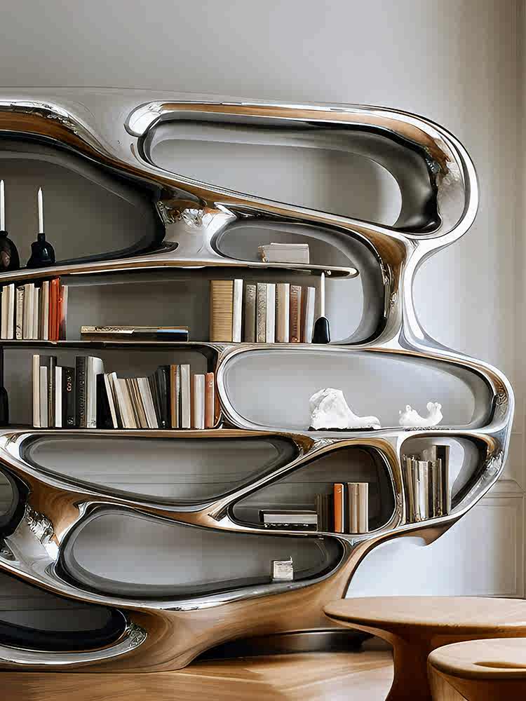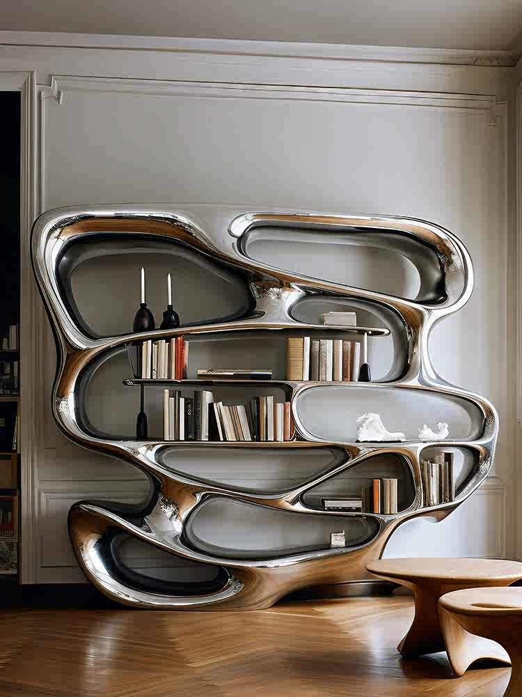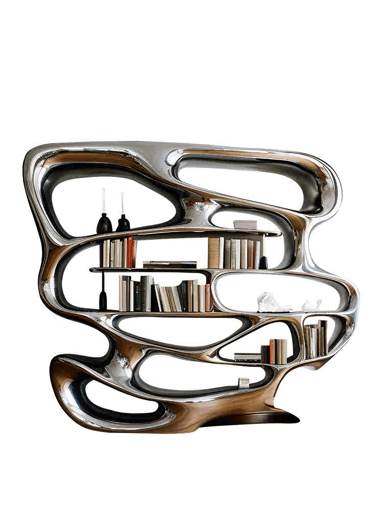 KASKOM Designer Flowing Chrome Steel Bookshelf with Organic Curves, Modern Art Sculptural Storage Unit for Study Room